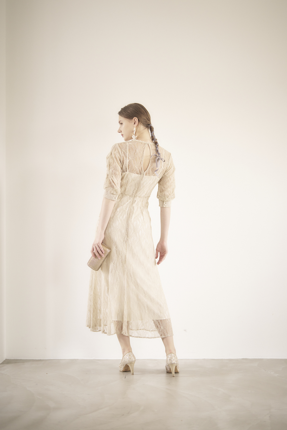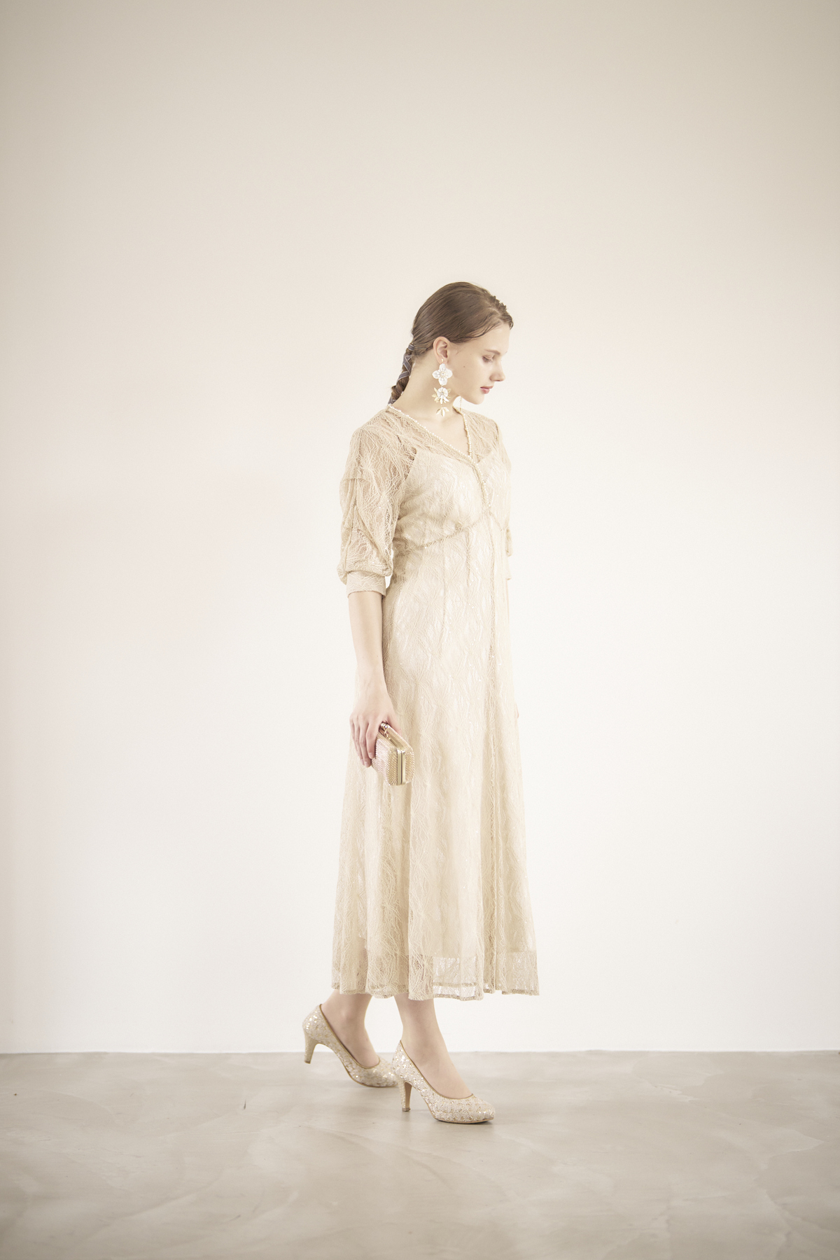 Vネックラインに沿って並んだパールデコルテを綺麗に見せてくれます。スパンコールとレースモチーフの組み合わせなど、細部まで上品な印象。