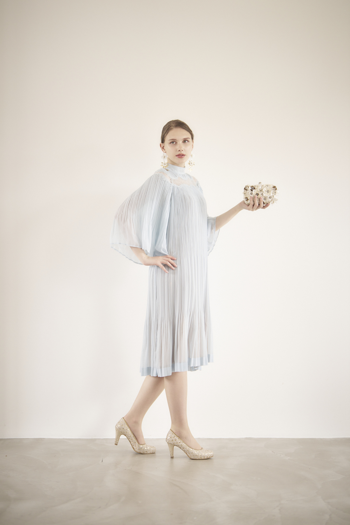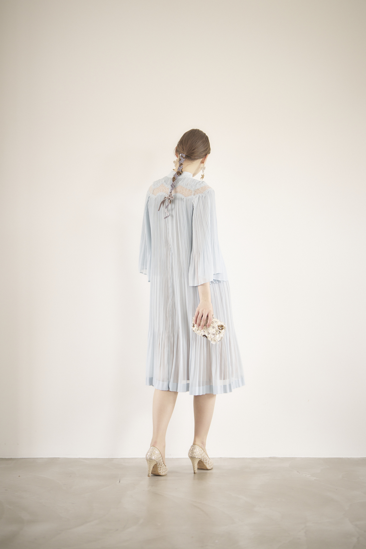 袖口と裾部分はプリーツを2度掛けして、ふんわりとした動きのあるAラインのシルエットに。