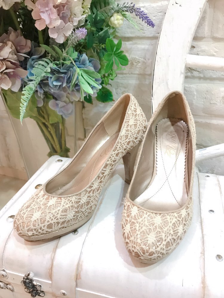 オールマイティに使える ゴールド×ベージュの上品パンプス