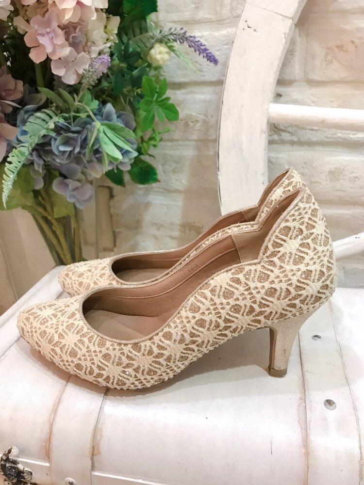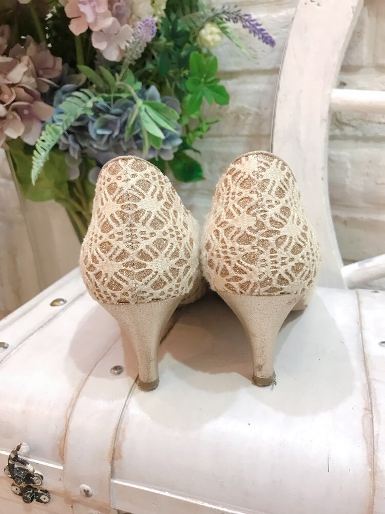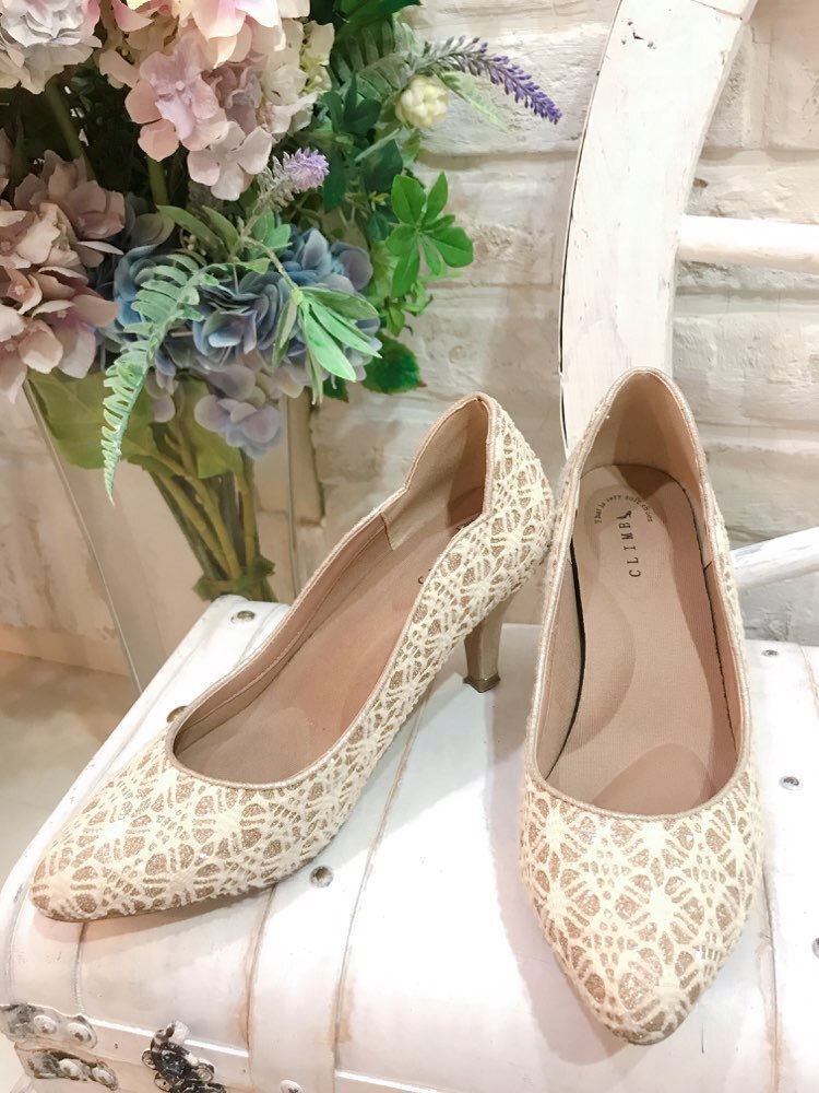 オールマイティに使える ゴールド×ベージュ ポインテッドトゥレースパンプス