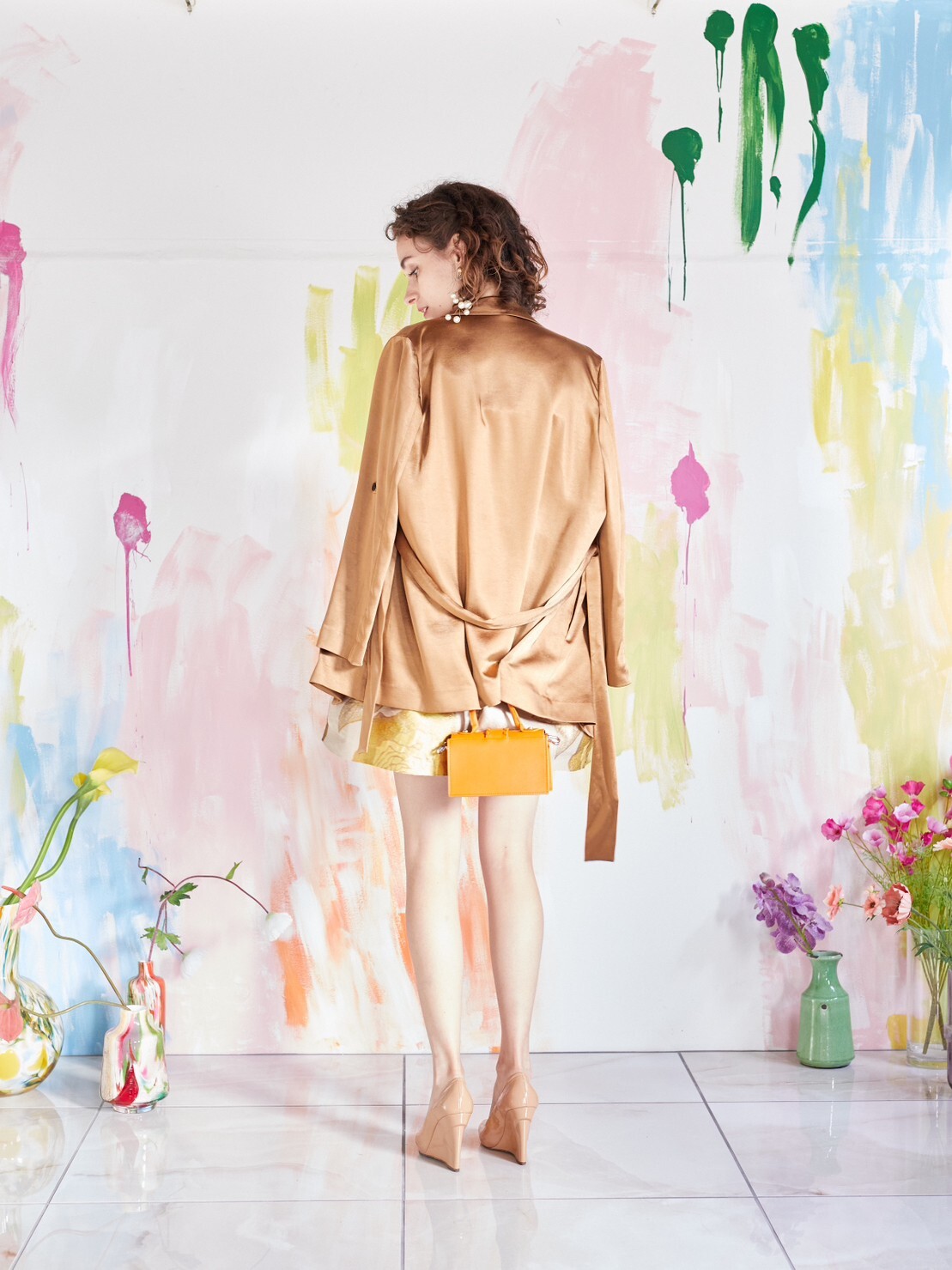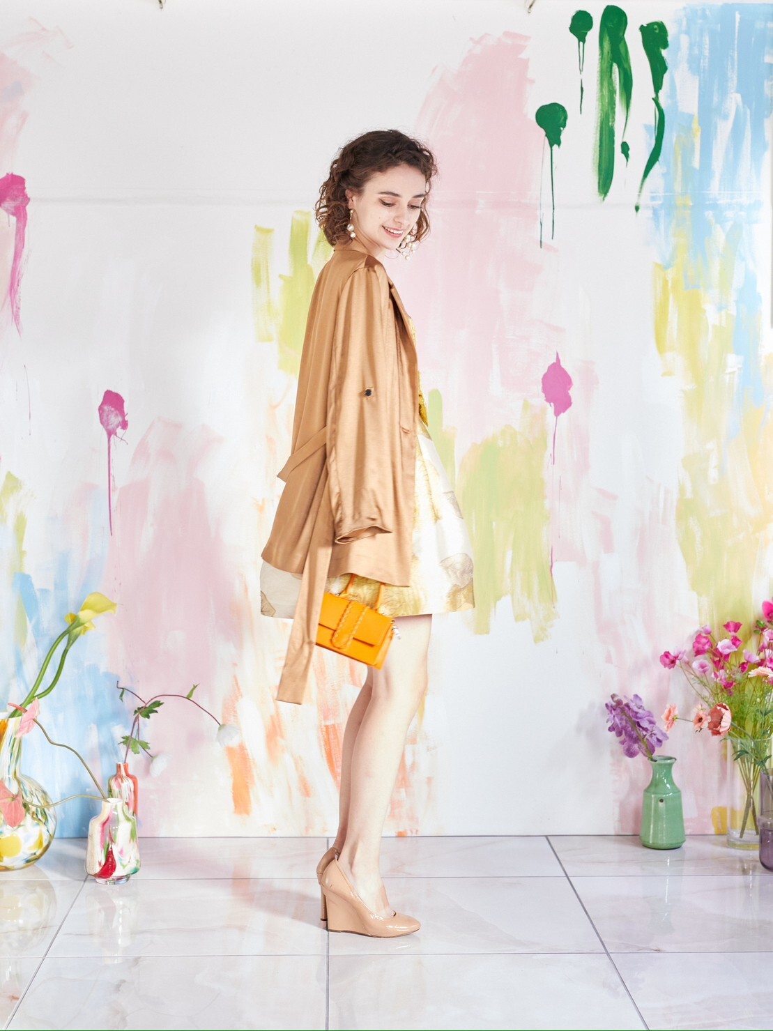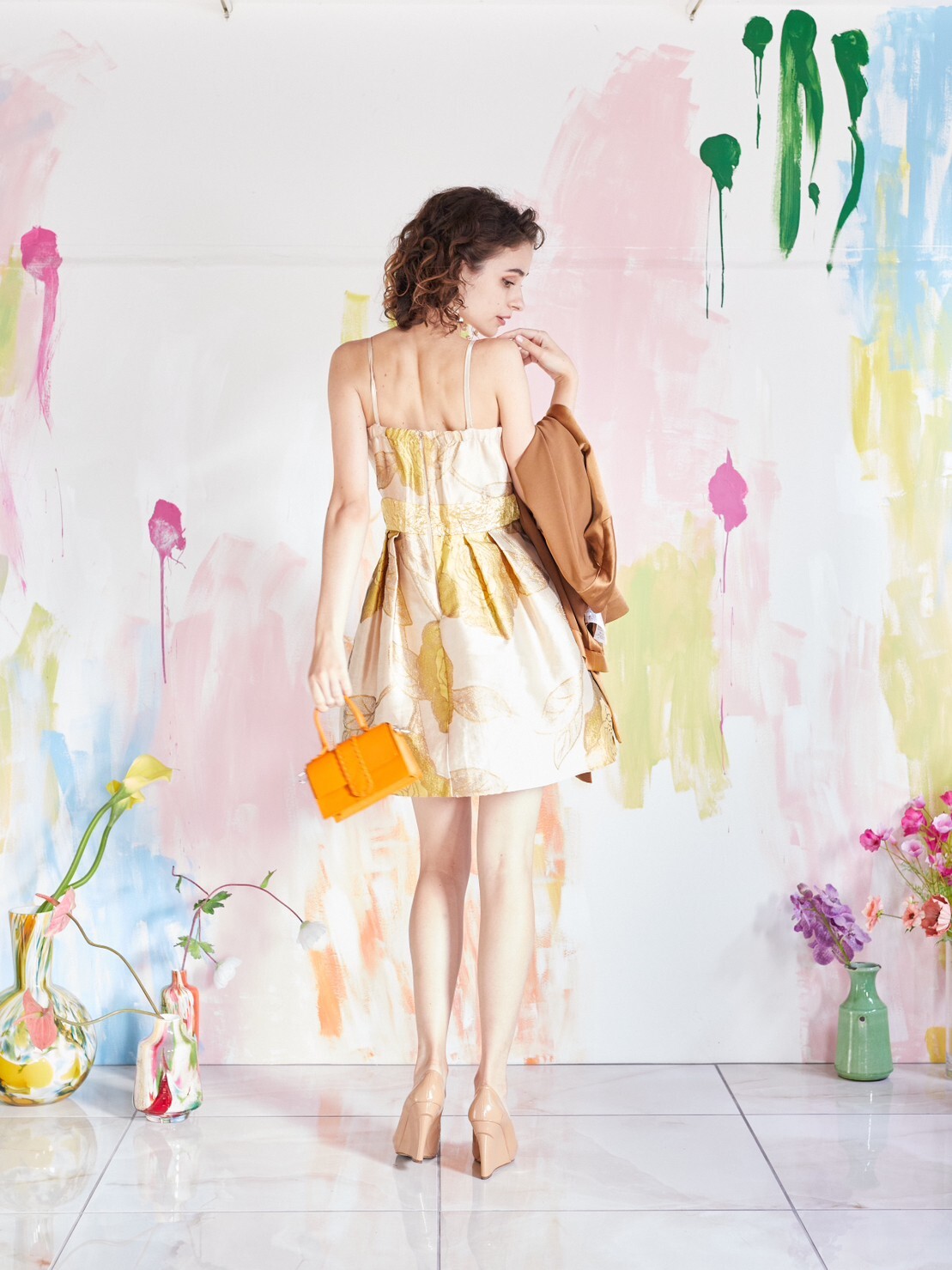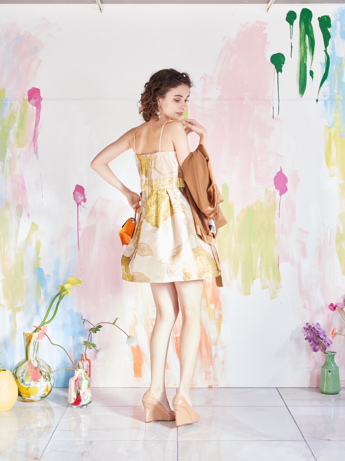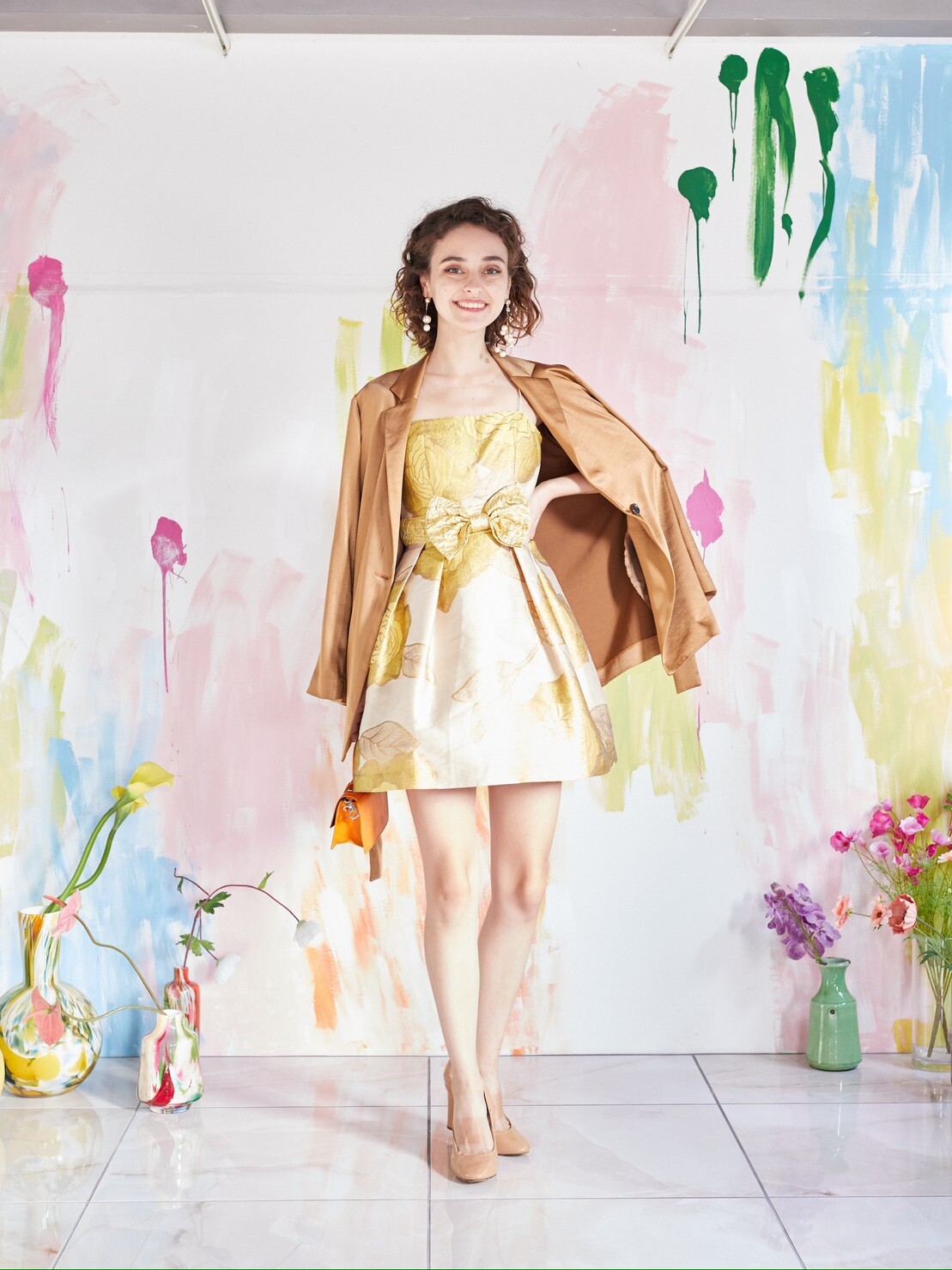 イエローカラーに大きめな柄がポイントのミニ丈ベアドレス。和柄のようなテイストでパリッとした生地感が印象で珍しいドレスです。ウエストに大きめのリボンがアクセントになっていてとっても可愛いです。ウエストにリボンがあることでウェストラインをスッキリとみせてくれます。小物を黒系でまとめてるとメリハリのあるコーディネートになり、ゴールド系でまとめるとゴージャスさを演出出来ます。パーティーや謝恩会にもお勧めのドレスです。