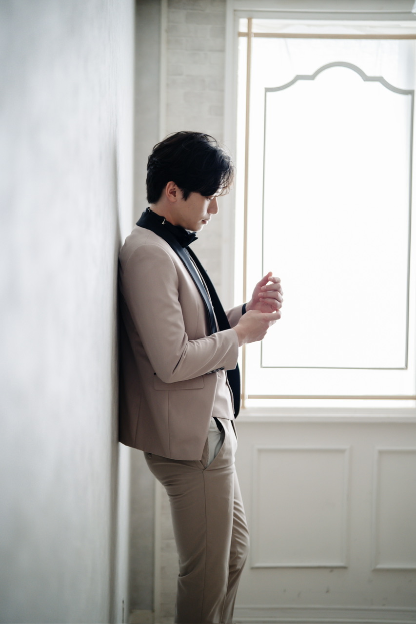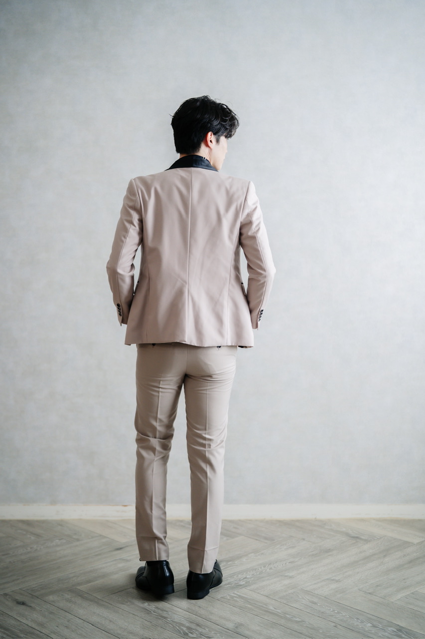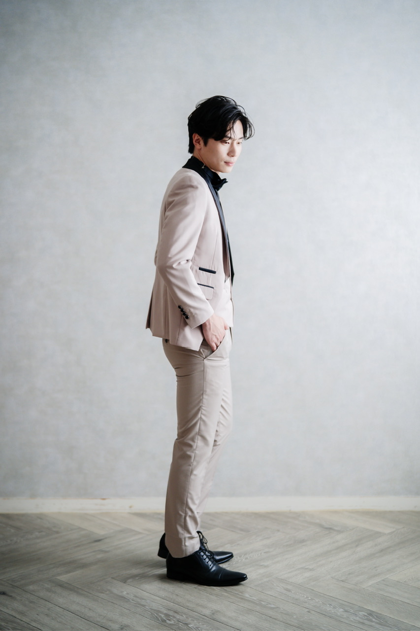 結婚式や前撮りにおすすめの新郎用スリーピースタキシード。柔らかなベージュカラーのジャケットとパンツに、ブラックのショールカラーを組み合わせることで、クラシックかつ洗練された印象を与えます。ベストを合わせた正統派の3ピース仕様で、挙式から披露宴、二次会まで幅広いシーンに対応可能。明るいベージュが写真映えし、花嫁のドレスとの相性も抜群。フォーマルさと華やかさを兼ね備えた、新郎にふさわしい特別な一着です。