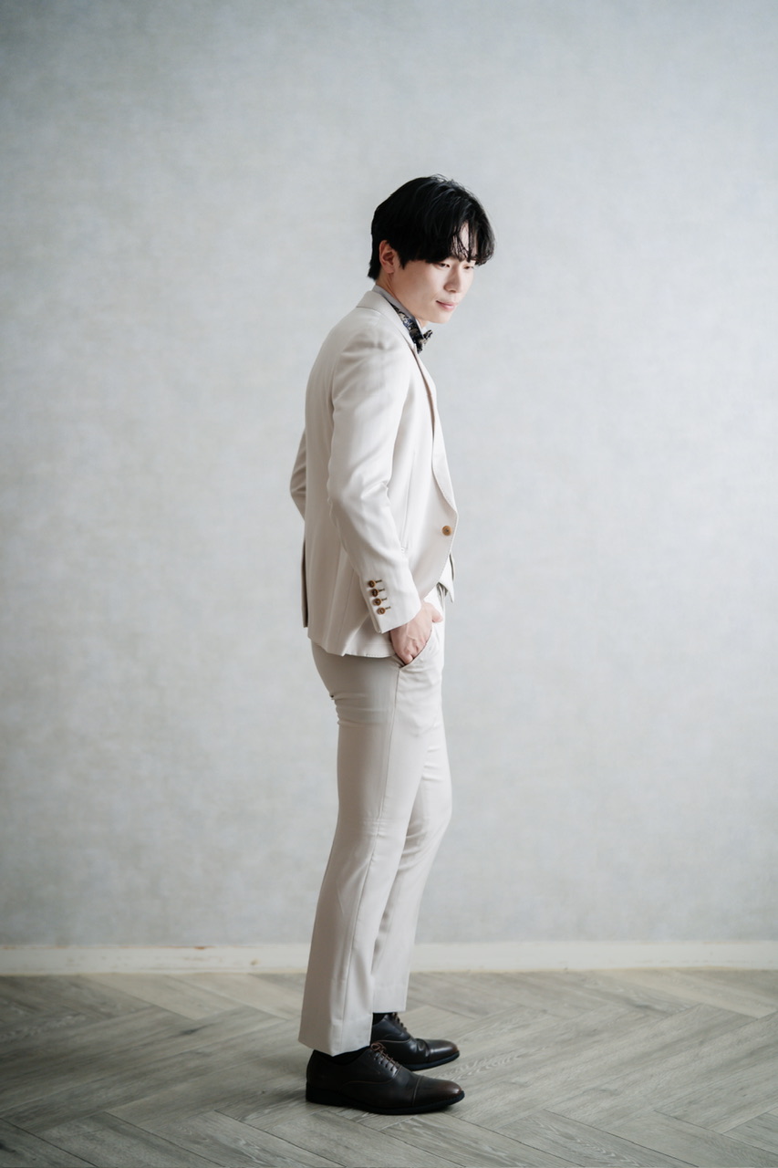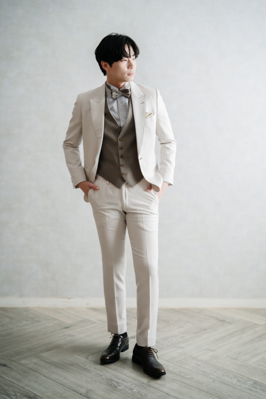 柔らかく上品な色合いが花嫁のドレスと相性抜群で、写真映えするフォーマルスタイルを演出します。襟にはさりげないステッチが施され、ディテールまで洗練されたデザイン。さらにベストはホワイトベージュとセージグリーンのリバーシブル仕様で、シーンに応じて印象を変えることができます。挙式から披露宴、二次会まで幅広く活躍し、タキシード代わりとしても着用可能な一着です。