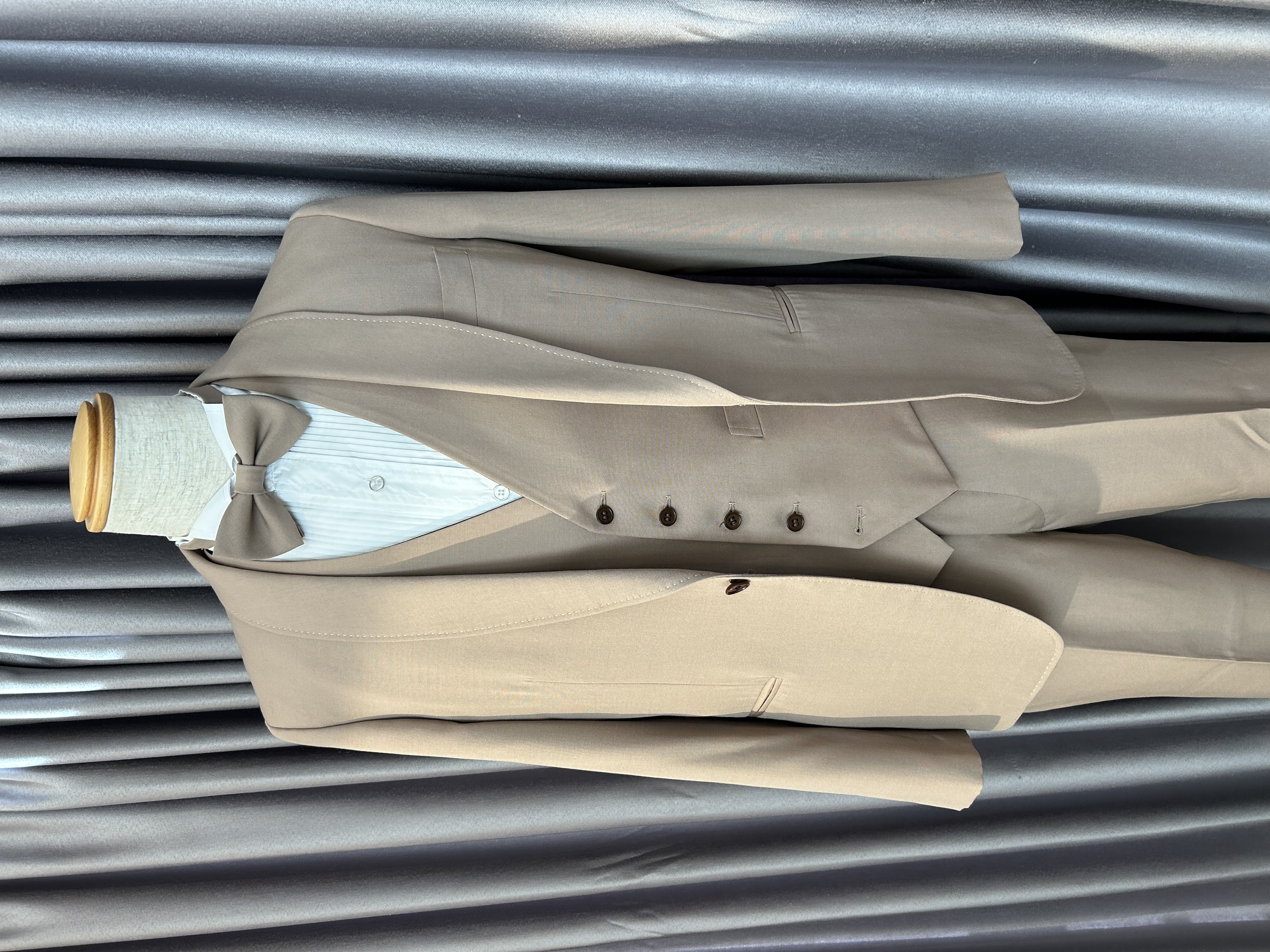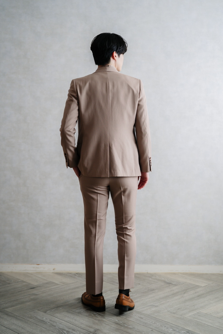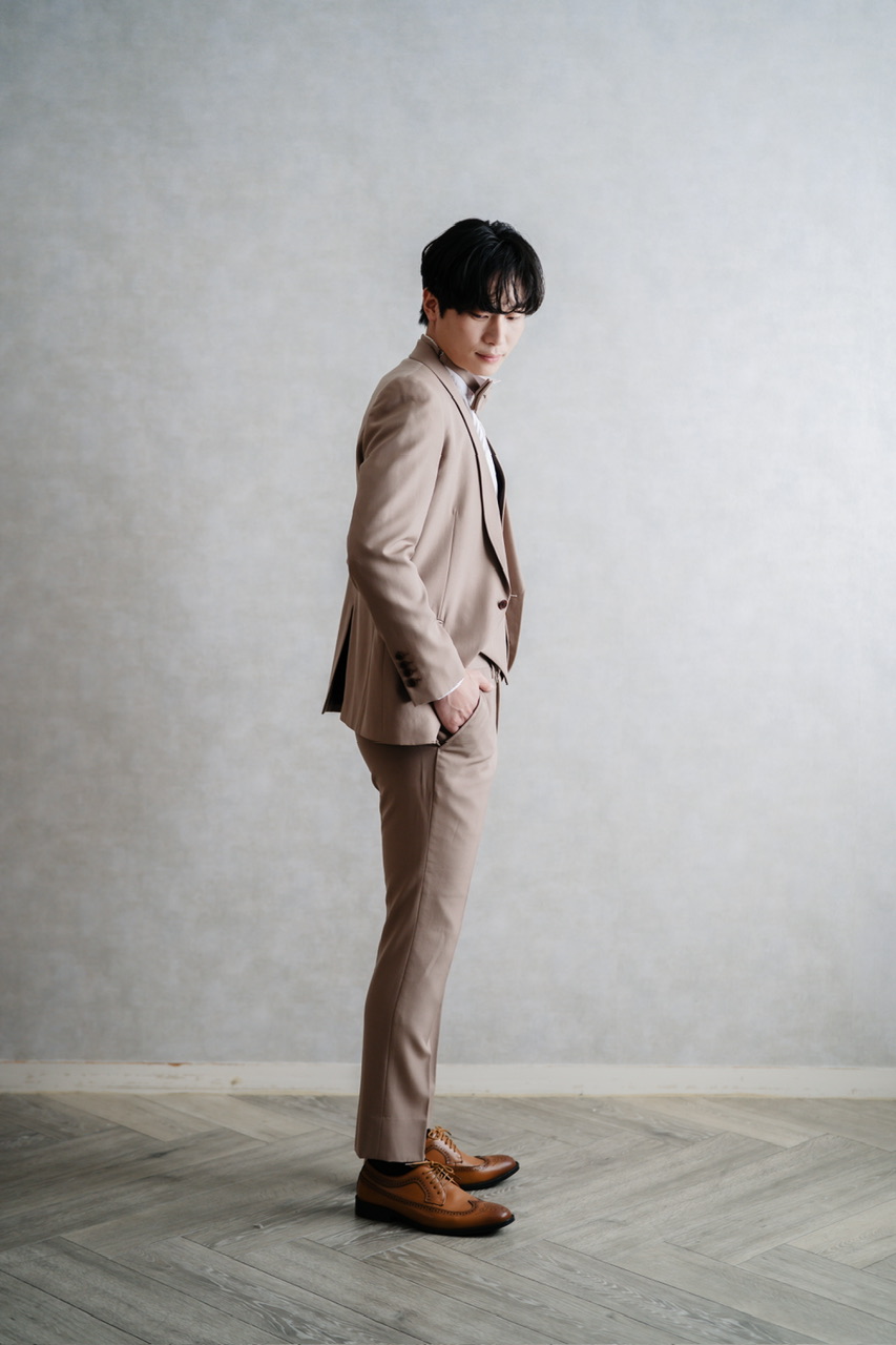 結婚式や前撮りにおすすめのライトブラウンスリーピースタキシード。優しい色合いが新郎をナチュラルで温かみのある印象に見せ、花嫁のドレスとも調和します。キャメルブラウンのボタンが可愛らしいアクセントとなり、ディテールにこだわりを感じさせます。さらに襟にはステッチが施され、シンプルながらも洗練されたデザインに。披露宴や二次会にも対応できるフォーマルスーツで、特別な一日をスタイリッシュに演出する一着です。