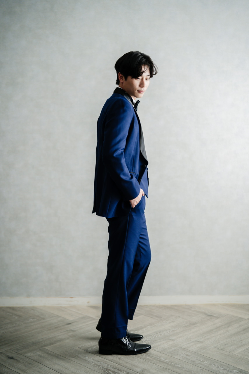 結婚式や前撮りに最適な新郎用 formalist ショールカラーネイビータキシード。クラシックなショールカラーの襟がエレガントさを引き立て、深みのあるネイビーカラーが洗練された印象を与えます。ジャケット・ベスト・パンツの3ピース仕様で、挙式から披露宴、二次会まで幅広いシーンに対応可能。定番のブラックタキシードに比べて柔らかさがあり、写真映えも抜群。フォーマル感とモダンさを兼ね備えた、新郎にふさわしい特別な一着です。
