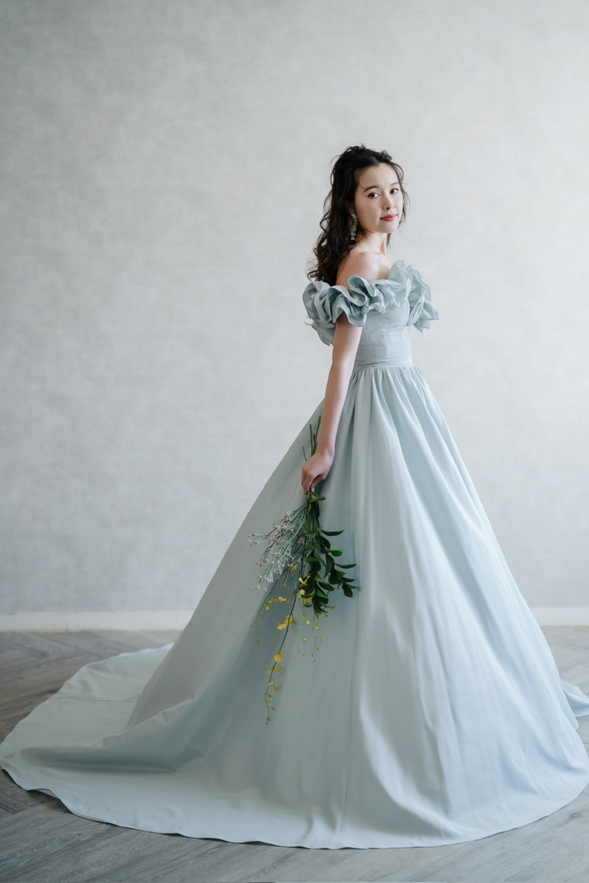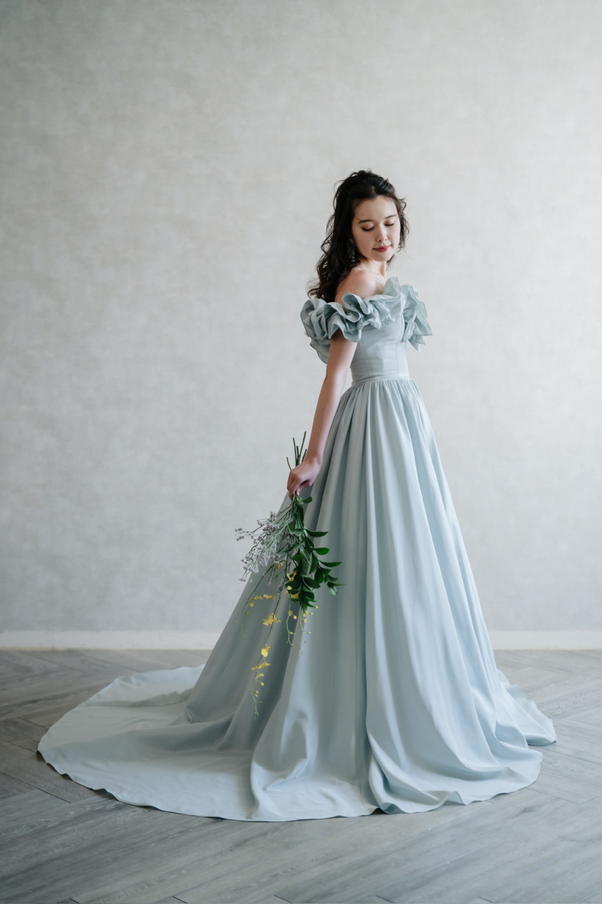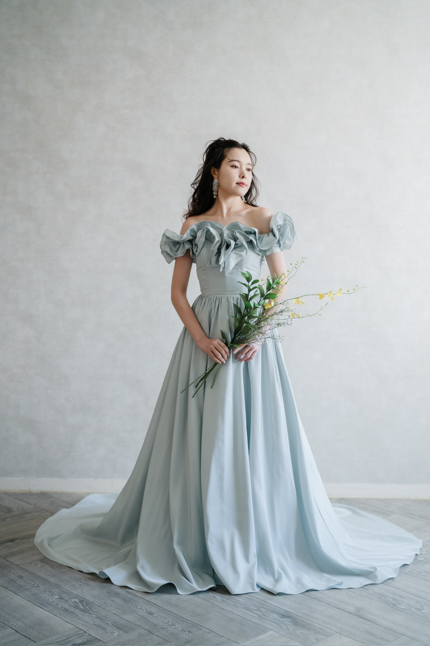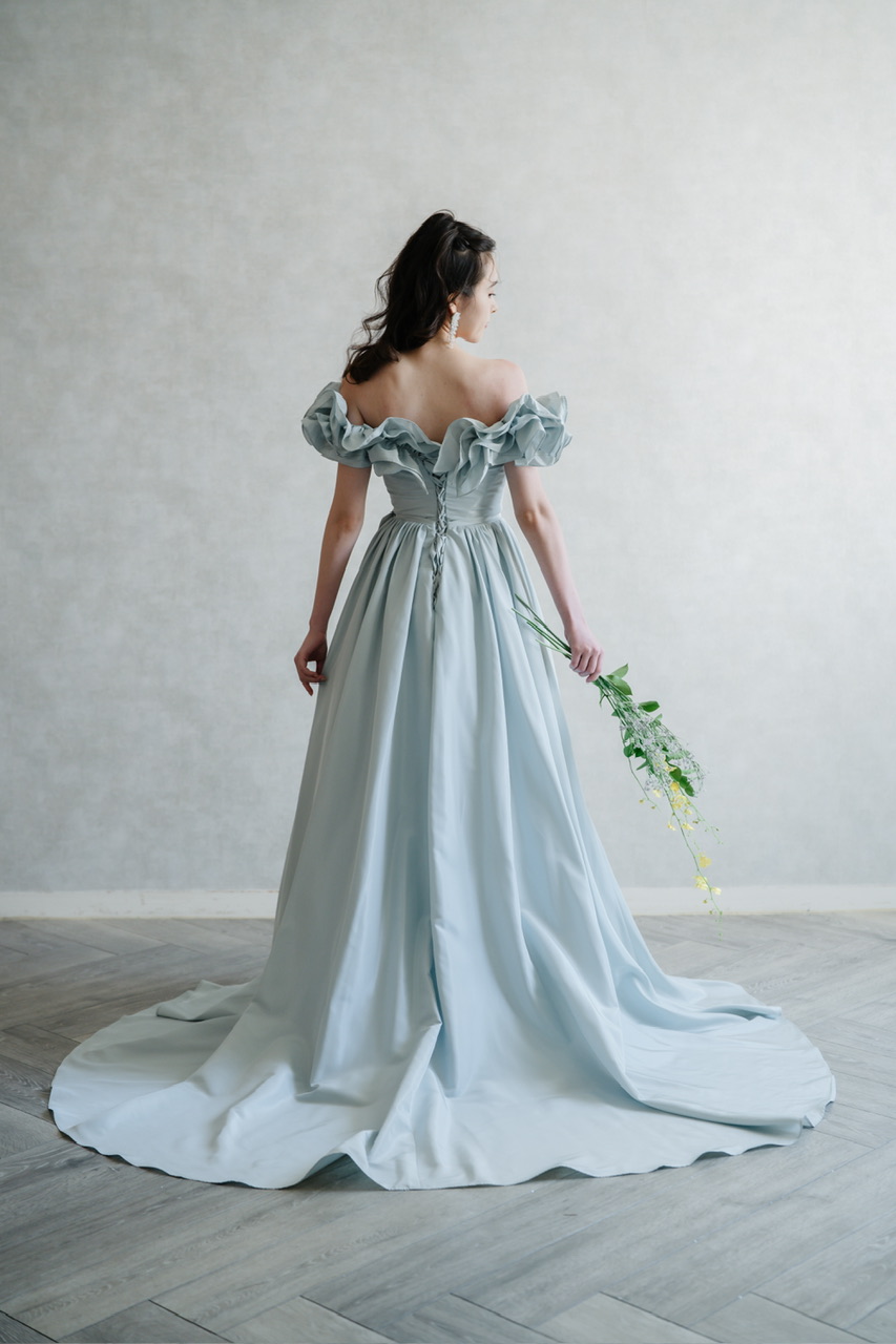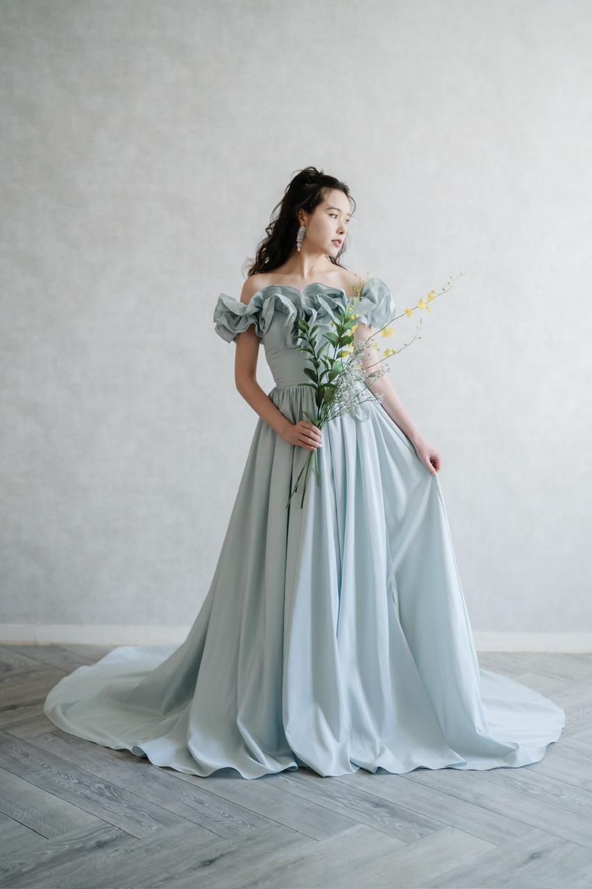 柔らかなアイスブルーが清楚で上品な印象を与えるAラインドレス。