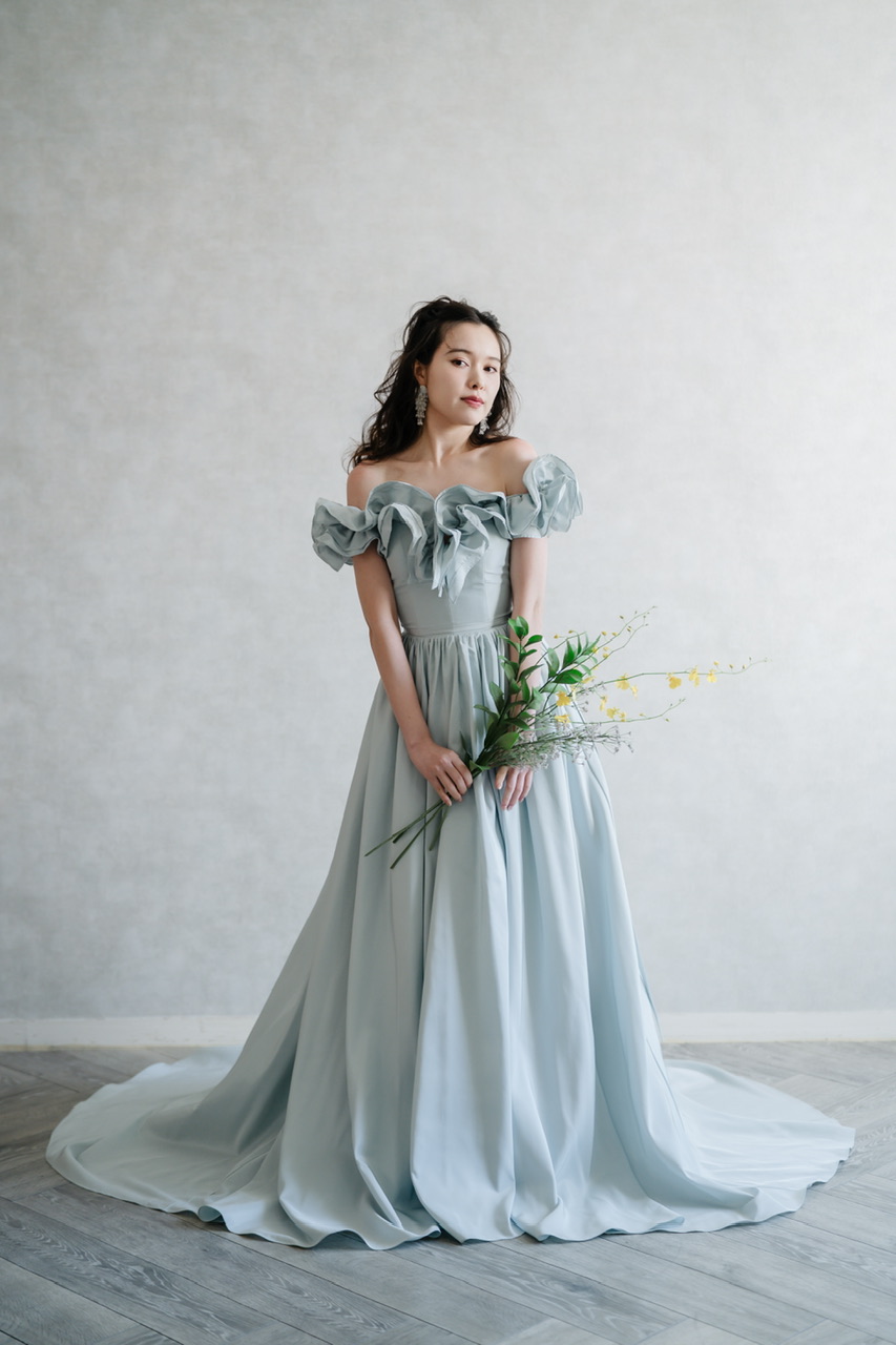 デコルテを美しく見せるオフショルダーに、贅沢にあしらわれたフリルが華やかさをプラスします。