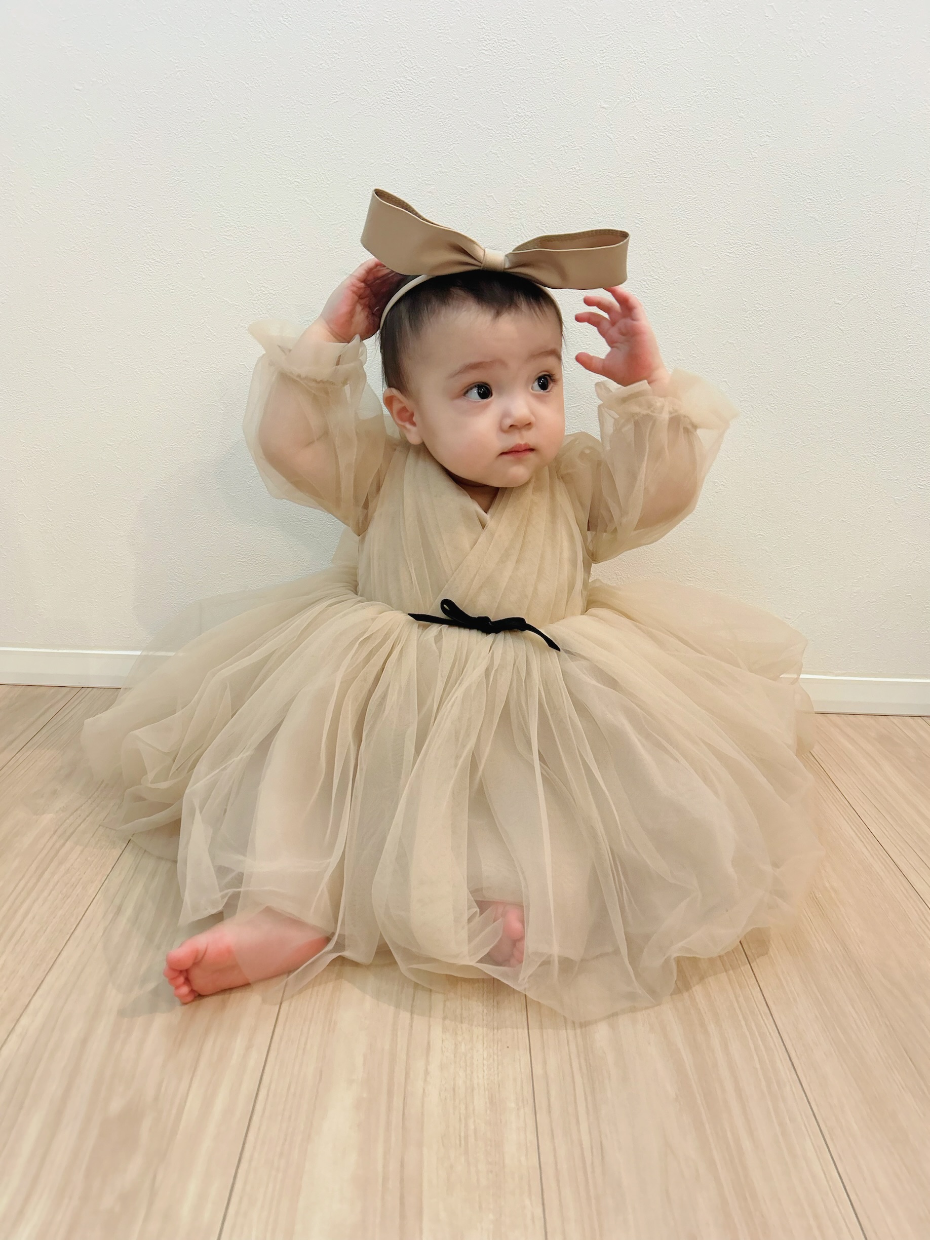 ベージュチュール×ブラックリボンキッズ&ベビードレス 80サイズ