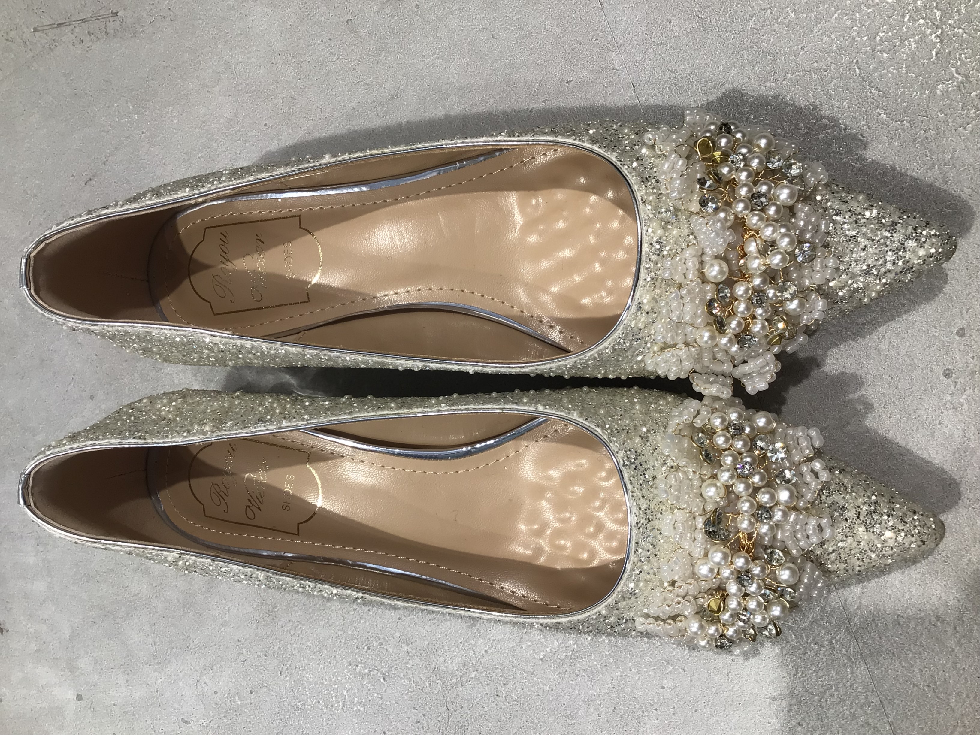 【パンプス】シルバーラメ パールビーズモチーフ 23.5 3cmヒール