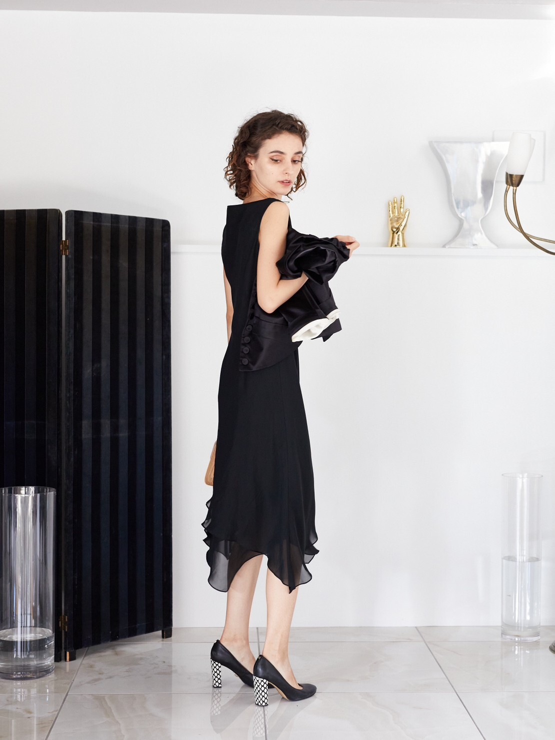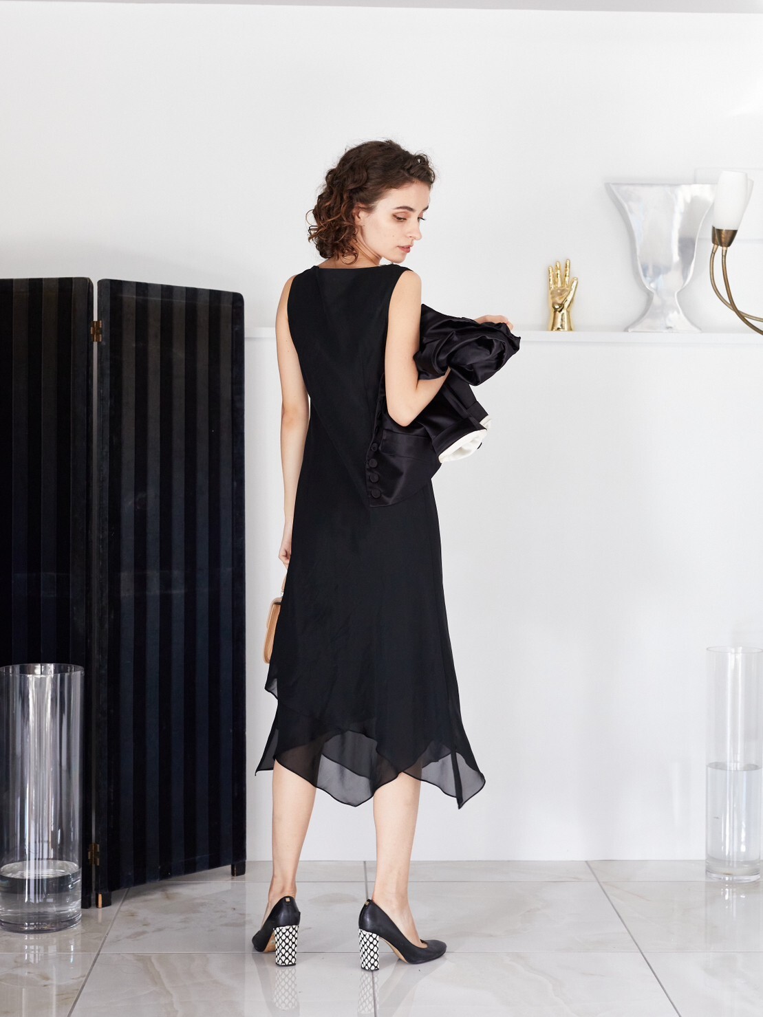 ブラックのノースリーブミモレ丈〜アンクル丈ドレス。胸元のスパンコールがワンポイントになっていて、オシャレなデザイン。裾の部分はイレヘムデザインになっております。結婚式やパーティーにお勧めです。ご新郎様ご新婦様のお母様にもお勧めな1着。ブラックなのでどんなシーンでも着て頂けます。バックやシューズなどの小物にお色味を入れてもまた印象が変わって素敵なコーディネートになります。