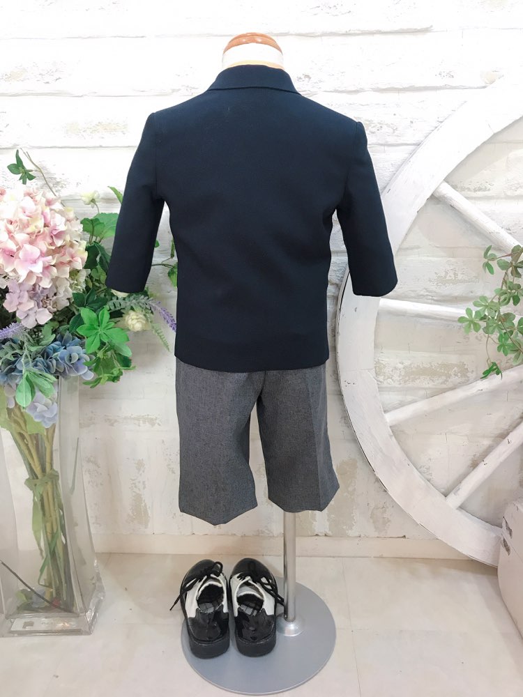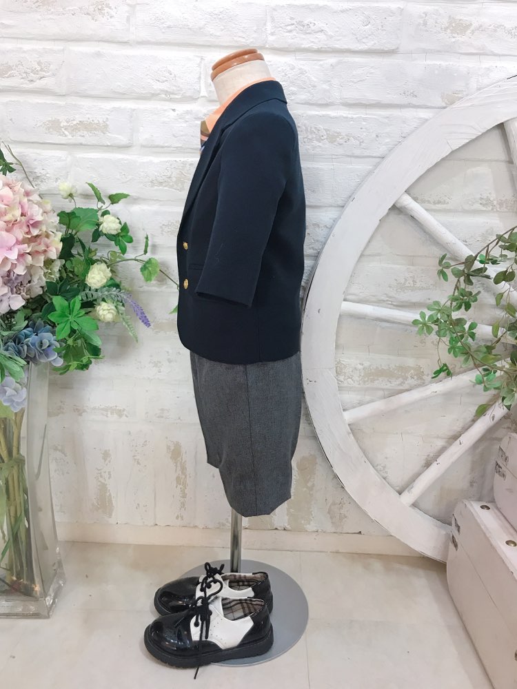 ネイビーの金ボタンがアクセントのブレザーに、爽やかなオレンジ色のシャツ、パンツはグレー、ネクタイはオレンジチェックのキッズタキシード。何と言っても可愛いブレザージャケットにオレンジシャツがとっても爽やか♪ジャケット付きなので秋冬におすすめです♪ブレザーのポケットは飾りポケット。ネクタイはシャツに挟むだけなので簡単に装着可能♪パンツのウェストは一周ゴムになっているので着心地抜群!結婚式、リングボーイ、ピアノや音楽発表会、七五三や写真撮影等にもおすすめです。