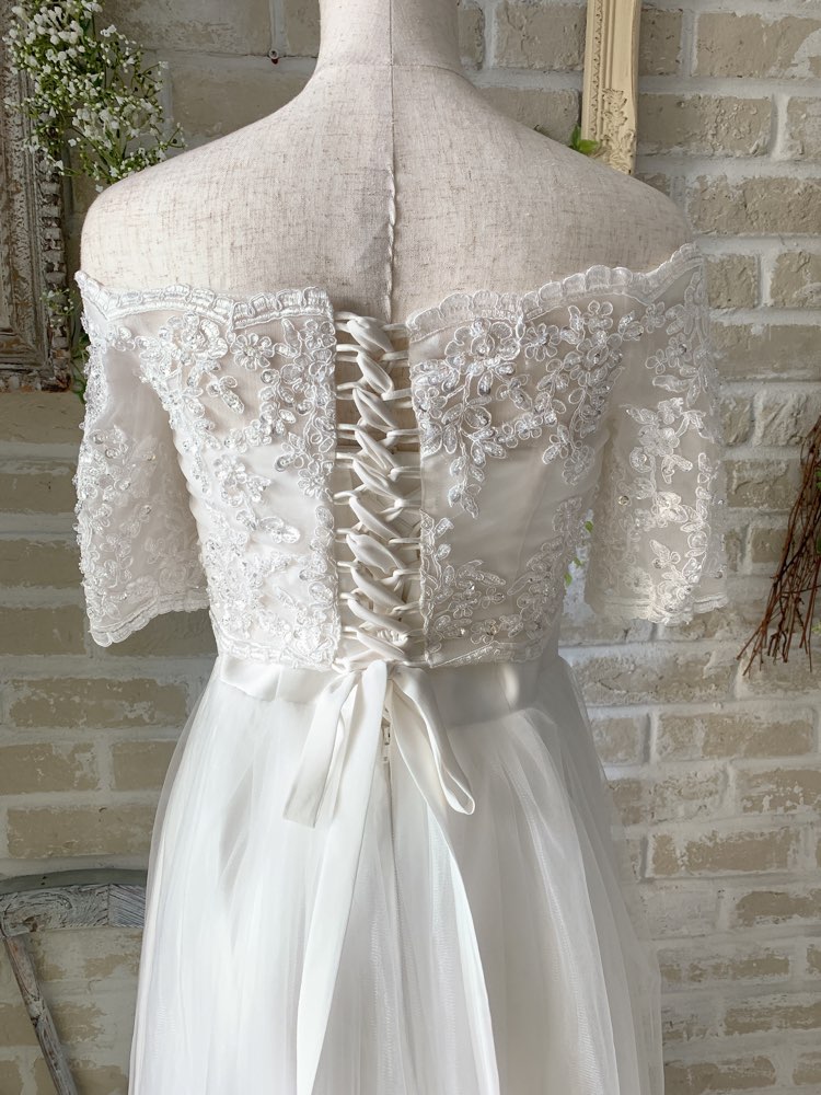 花嫁ウェディング用ホワイトレースオフショルダー編み上げボレロ