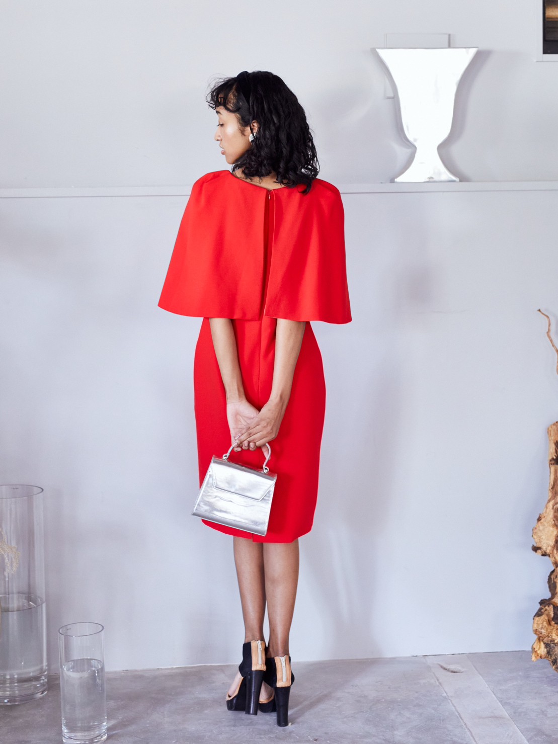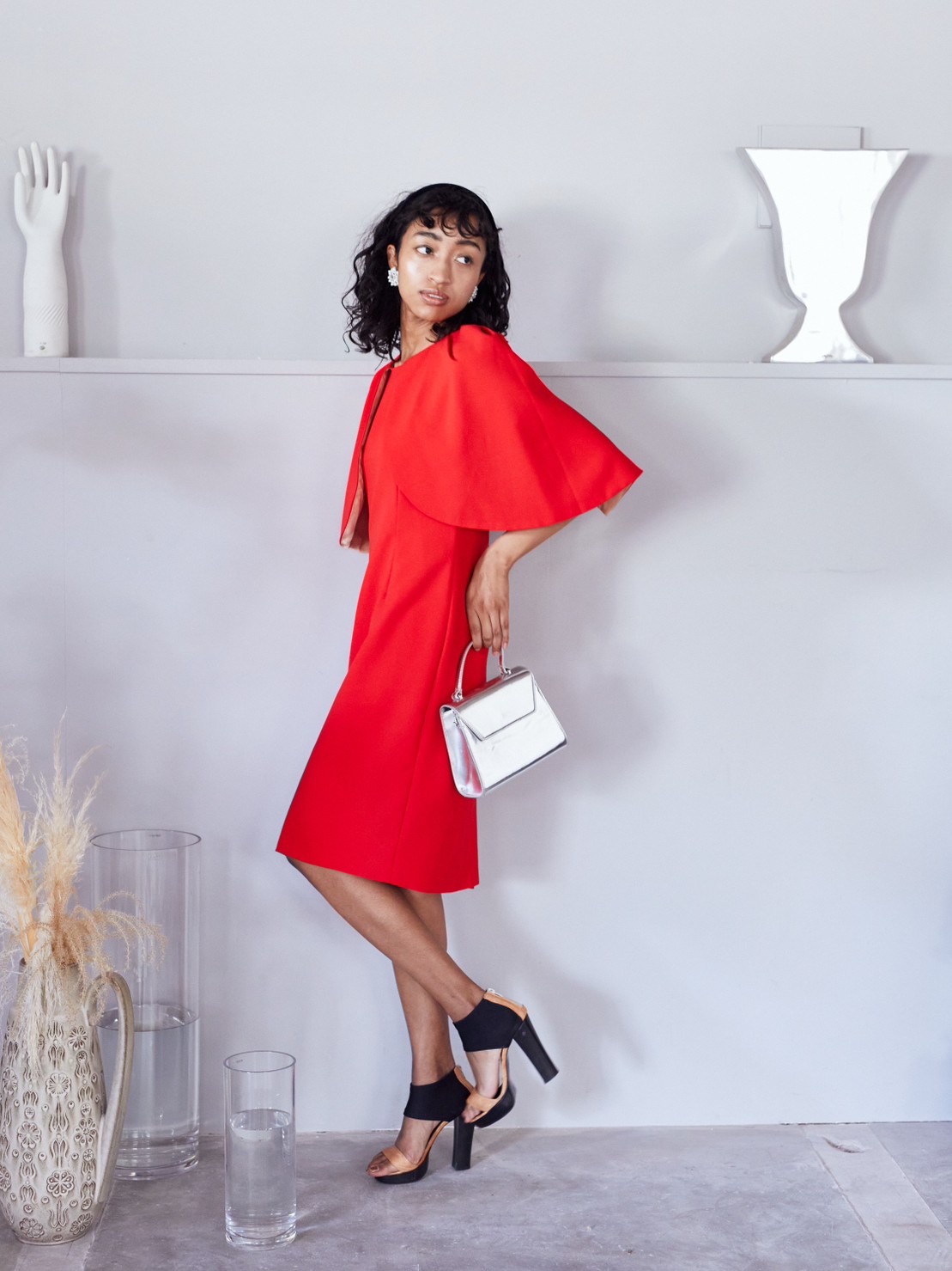 鮮やかなカラーでチューリップ袖が印象的な大人っぽいドレス。ウェストラインはスッキリとしてるので、スタイルアップになるドレス。小物に差し色を入れてもカジュアルな印象になります。パーティーなどにおすすめです。