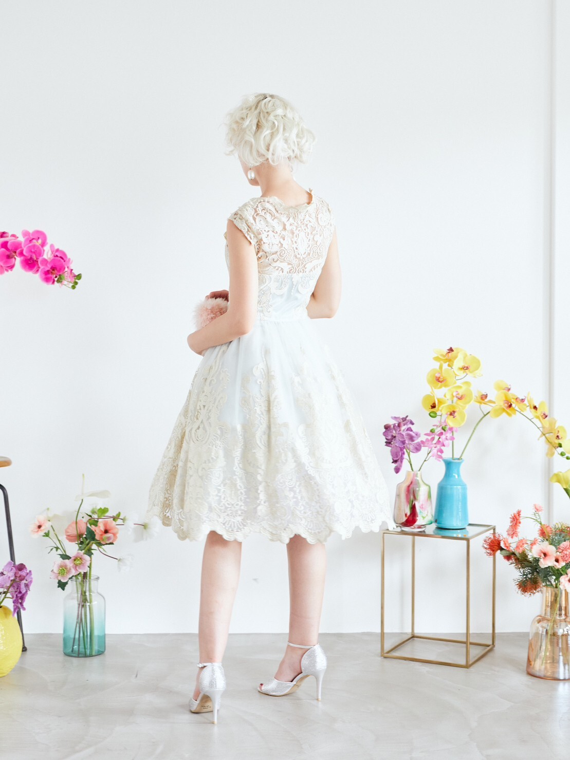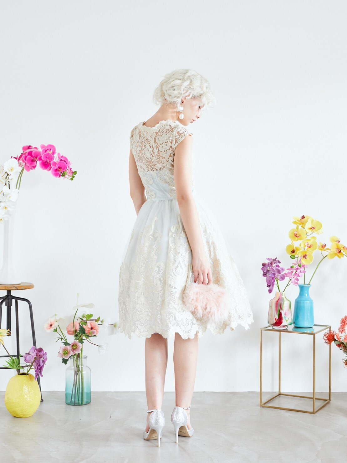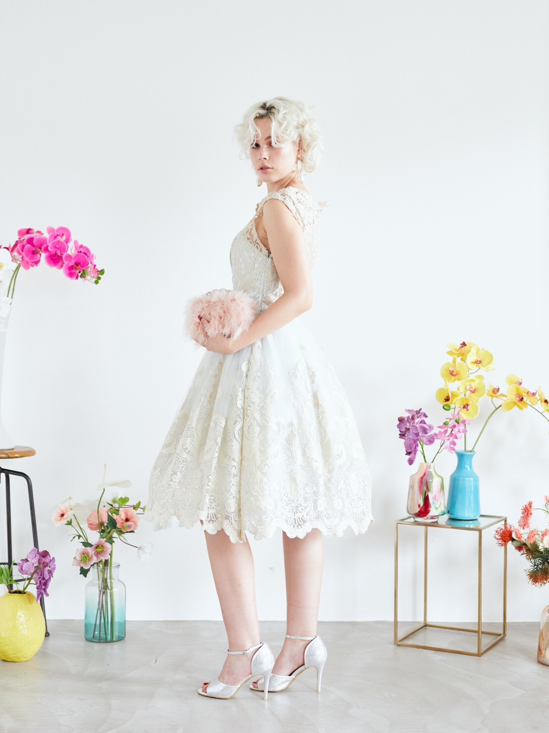 水色肩ありドレス。ゴールドのレース刺繍が可愛いです。スカート部分のボリュームがほどよく丈長めです。