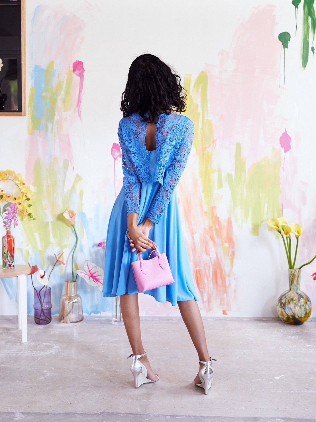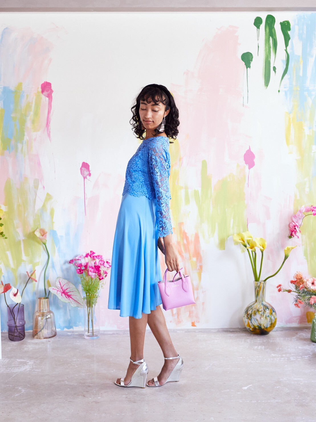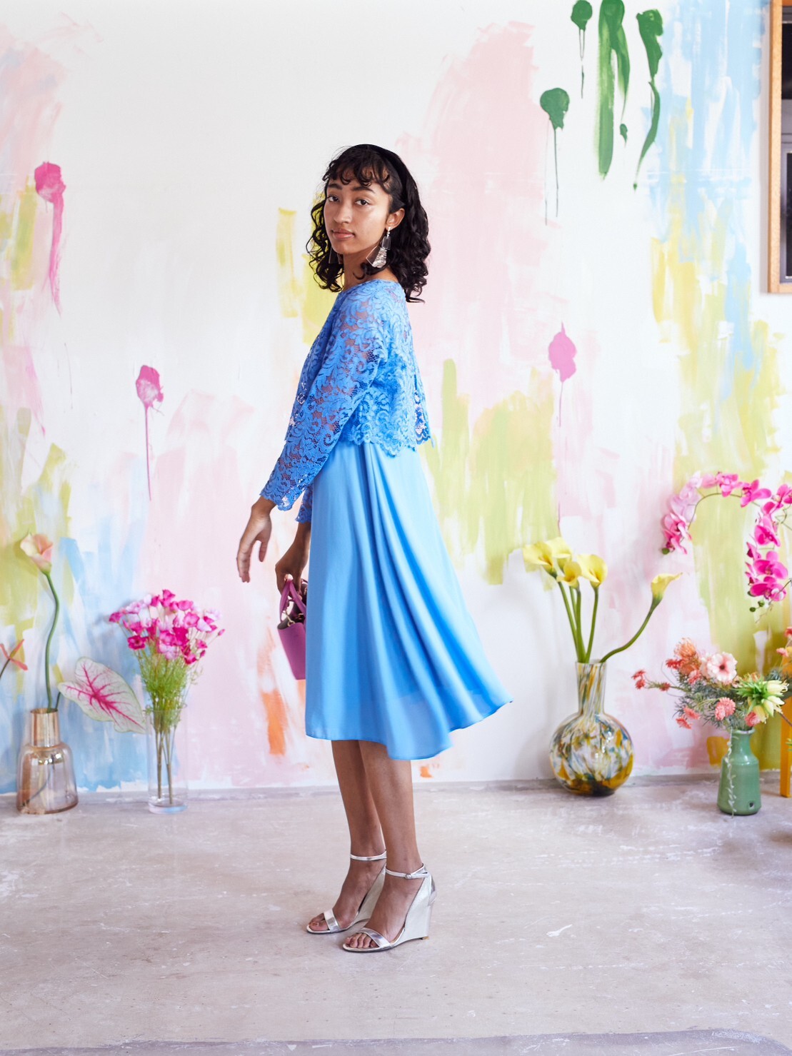 ブルー袖ありドレス。トップス部分がレース。伸縮性があるので着やすいです。