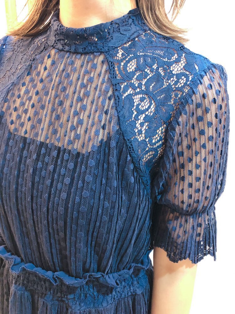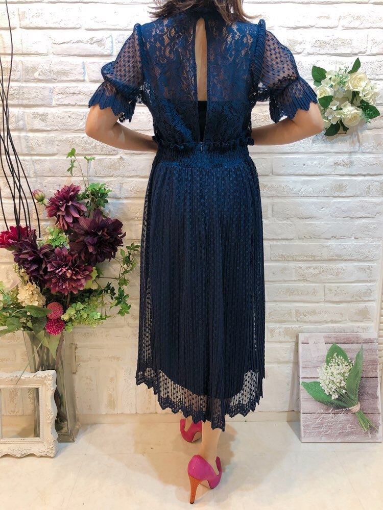 上品なネイビー総レース水玉五分袖ウエスト切り替えミモレ丈ドレス