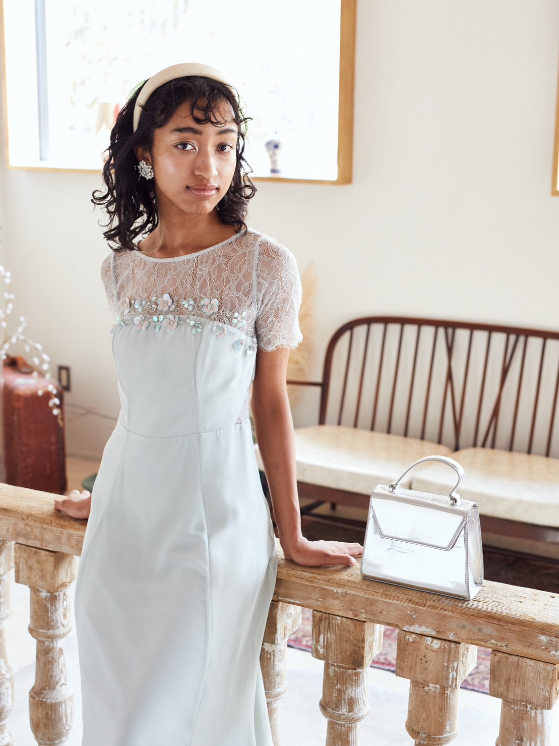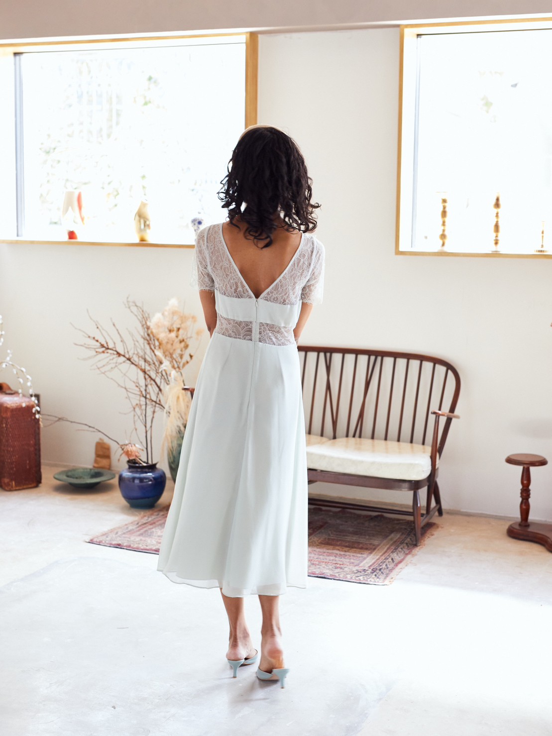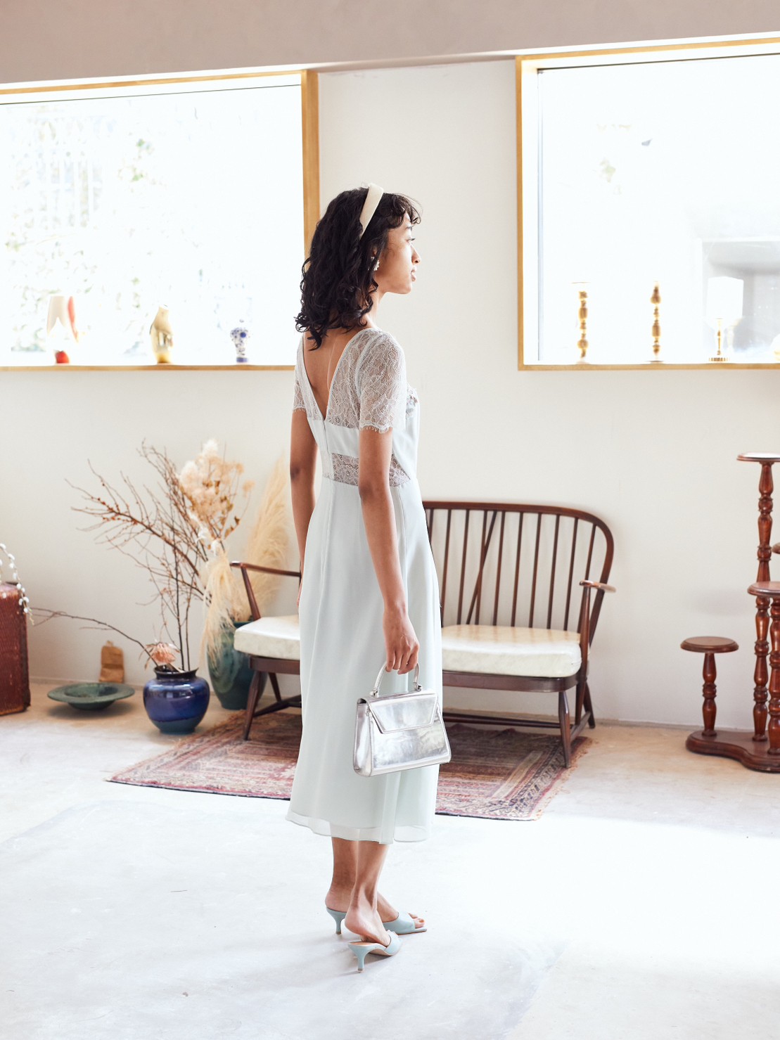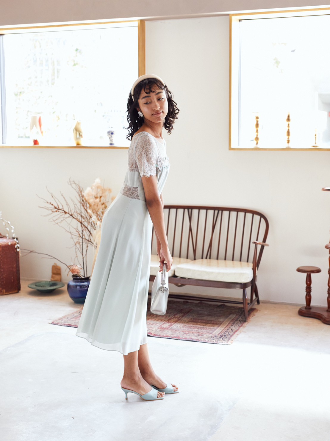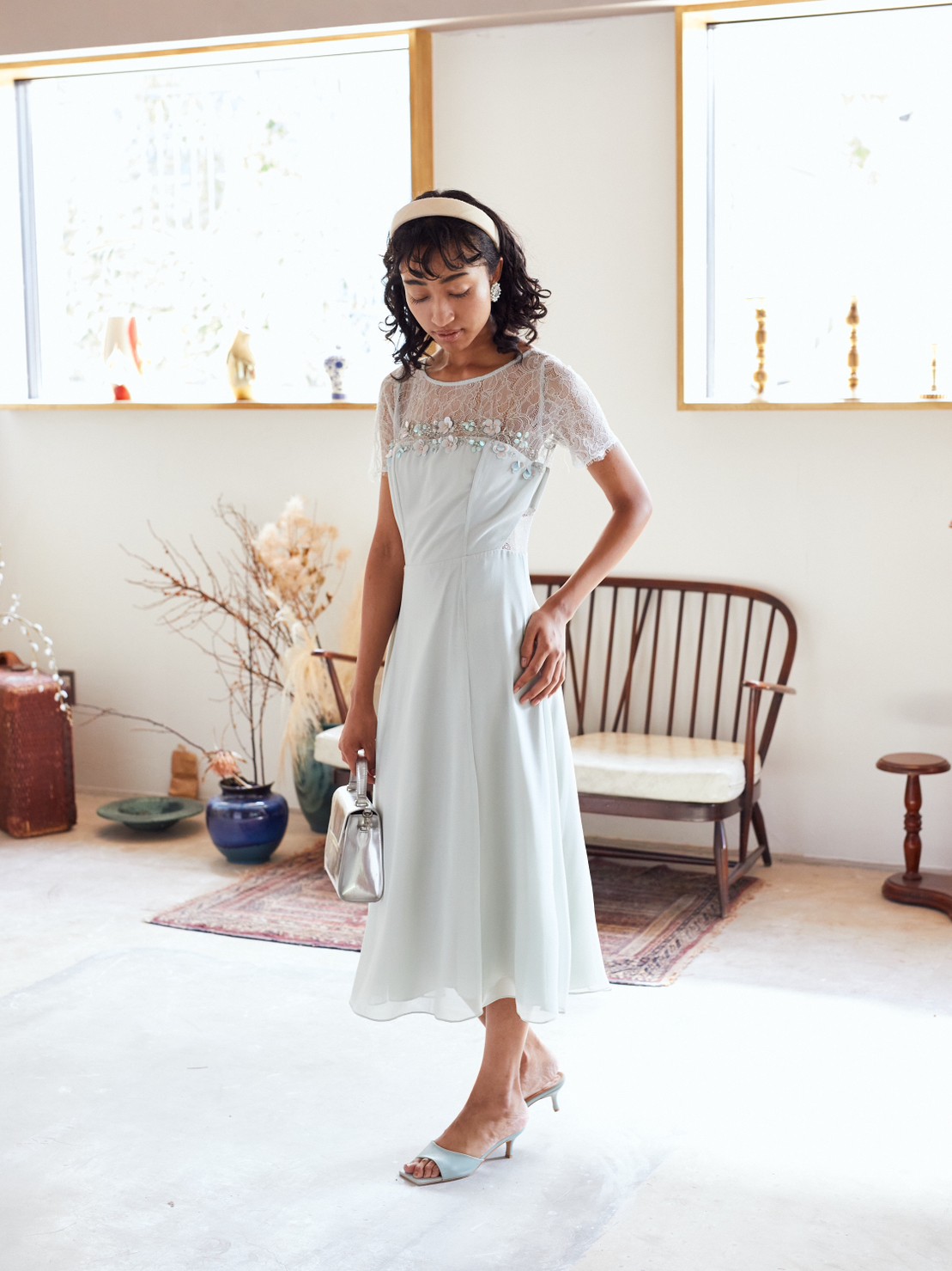 上品なペールグリーン上半身レース丈長めドレス