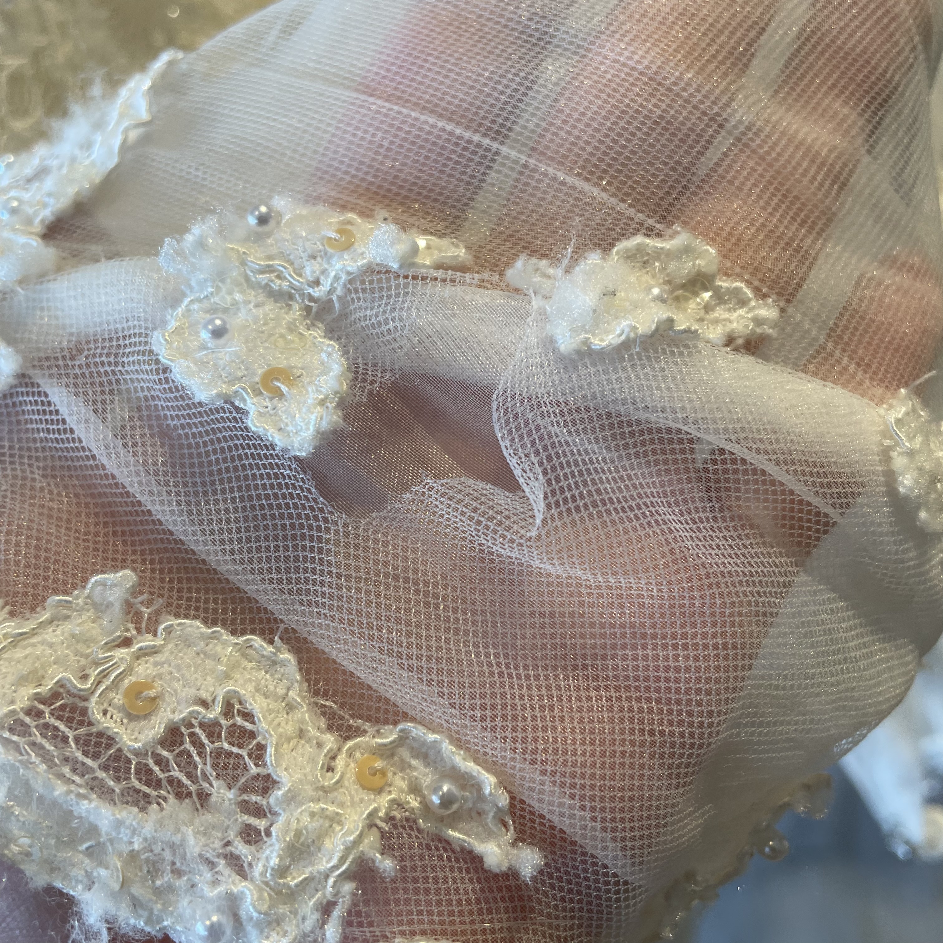 全体的に花柄が縫い付けられておりシンプル過ぎずオシャレな1枚でとても高級感があるアンクル丈のウェディングドレスです。