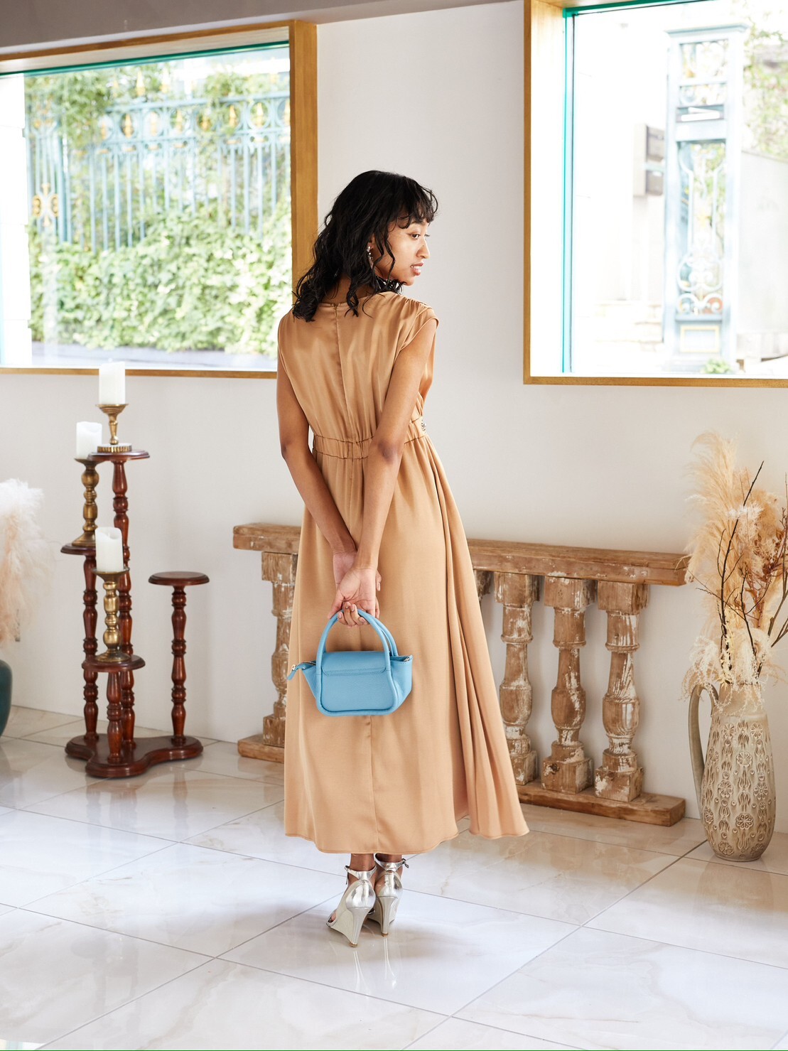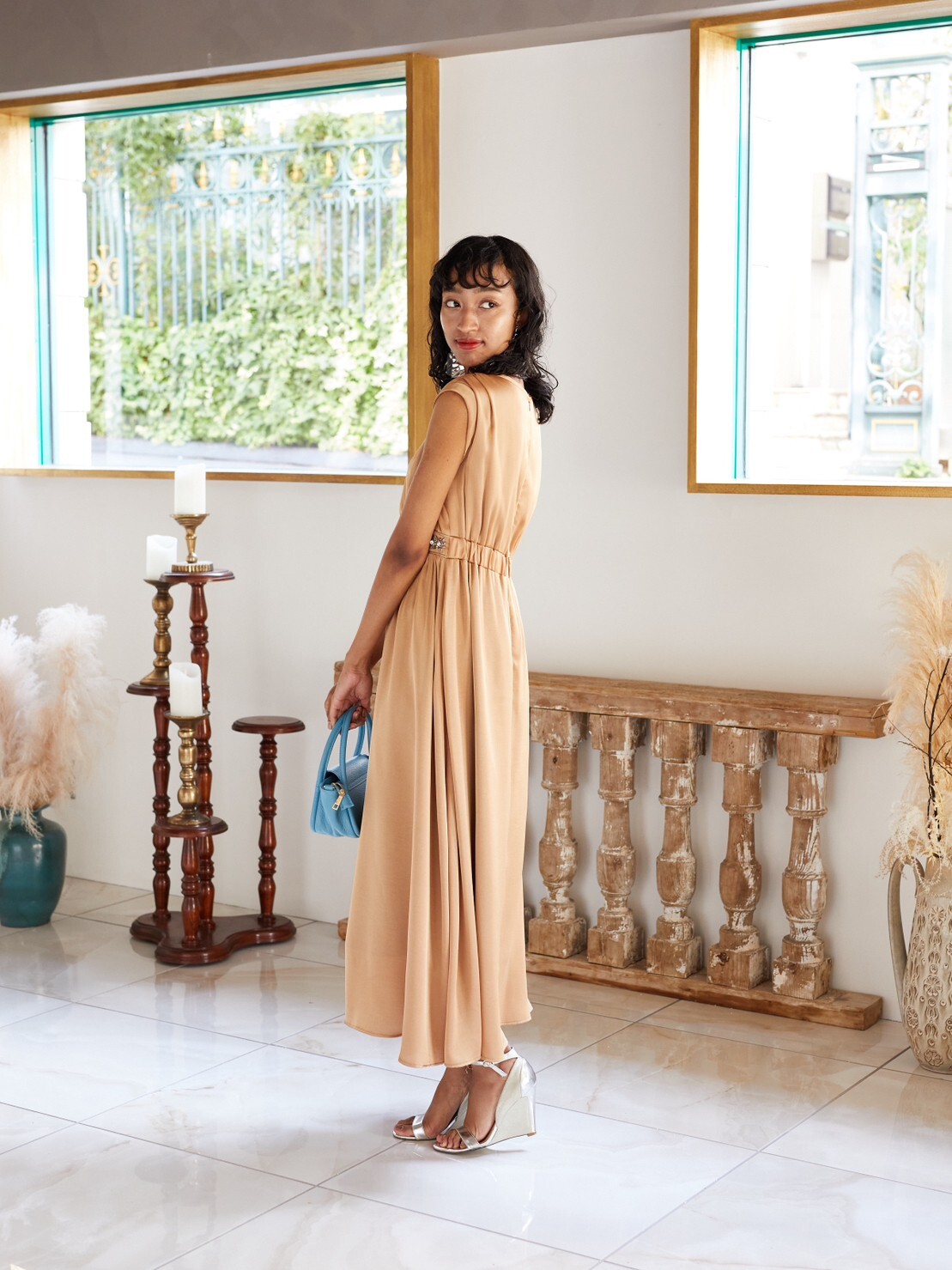 キャメルブラウンのドレス。生地は光沢のあるサテン地で華やかな印象です。ノースリーブタイプで首元は鎖骨にかかる程度の詰まり具合です。スカートはアンクル丈と長めのデザインなので露出が気になる方や大人の方も安心です。ビジューが可愛いウエスト部分は後ろがゴムになっています。アクセントにカラーのバッグを合わせるコーディネートがお勧めです。