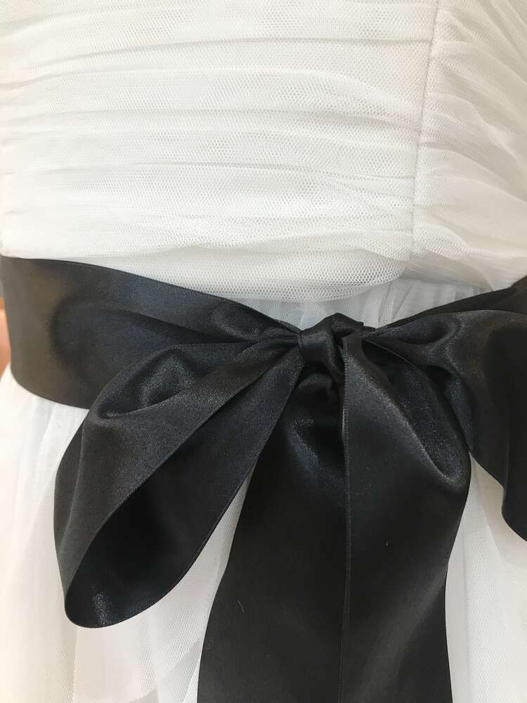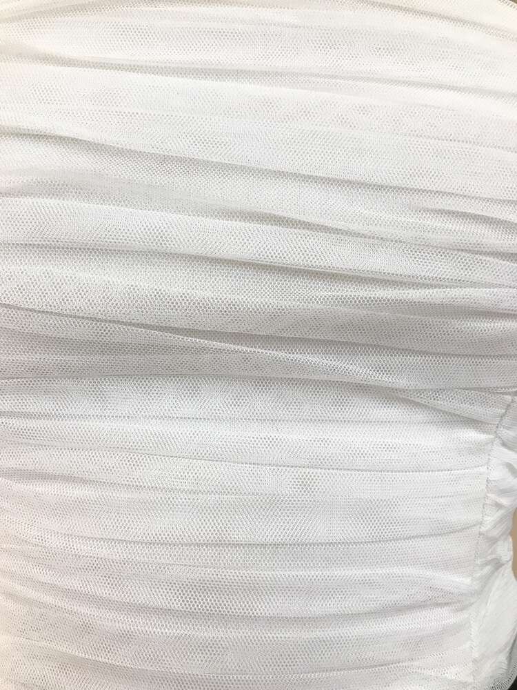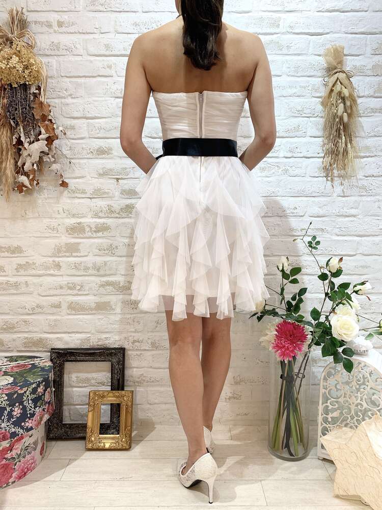 花嫁様2次会などカジュアルシーンにおすすめのホワイトミニベアドレスです。チュール素材のホワイトカラーにとりはずし可能なウエストのブラックリボン付き。上半身は若干ストレッチが入っておりフィット感がございます。スカートはたっぷりなフリルで可愛らしいシルエットに。花嫁様2次会やカジュアルなガーデンパーティー、リゾートなどにも活躍しそうな商品です。短めの着丈で身長の低い方にもバランス良く着用して頂けます。