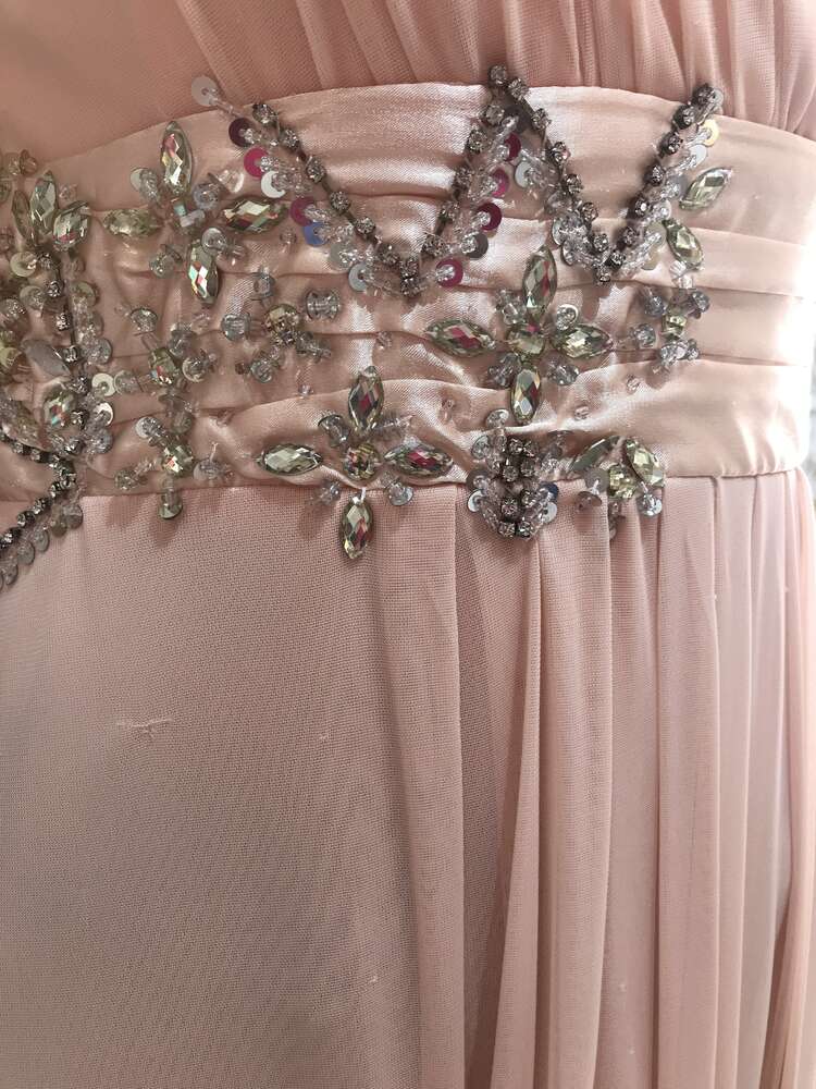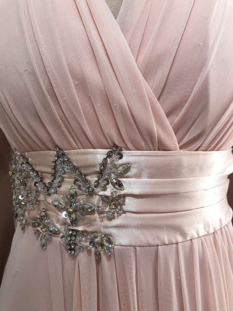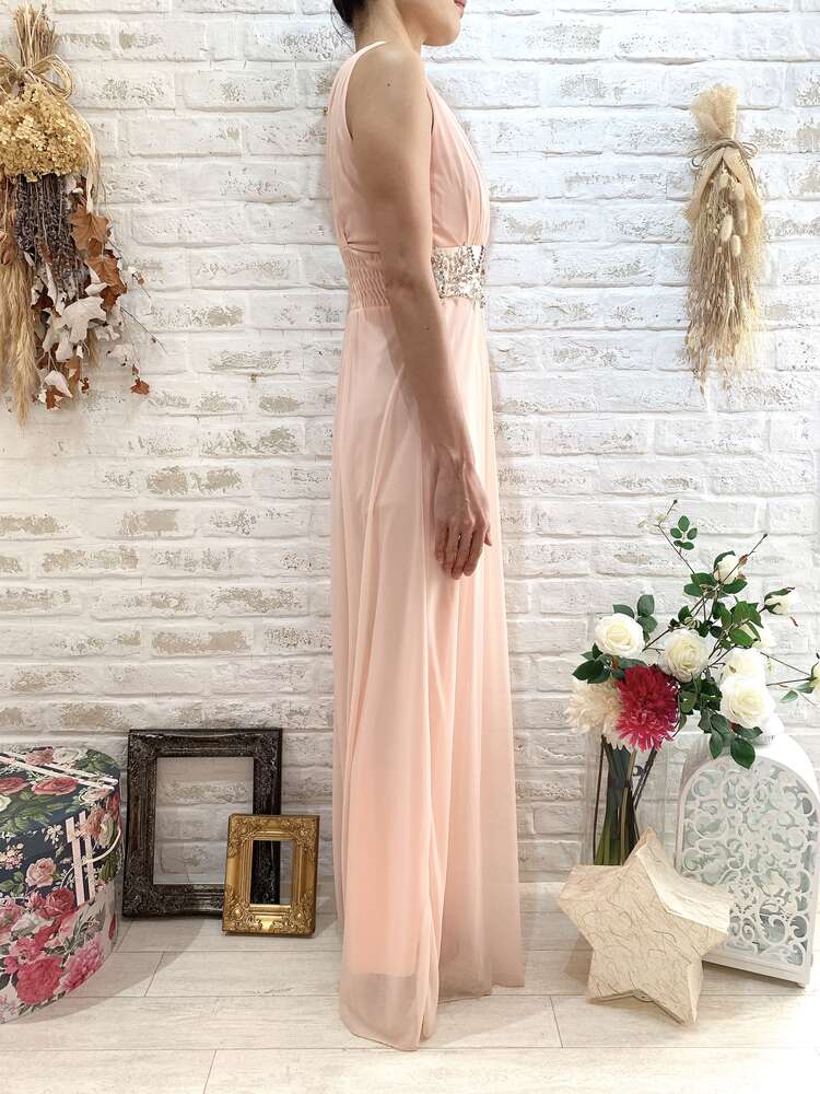 ピンクウエストビジューカシュクール型肩有ロングドレス